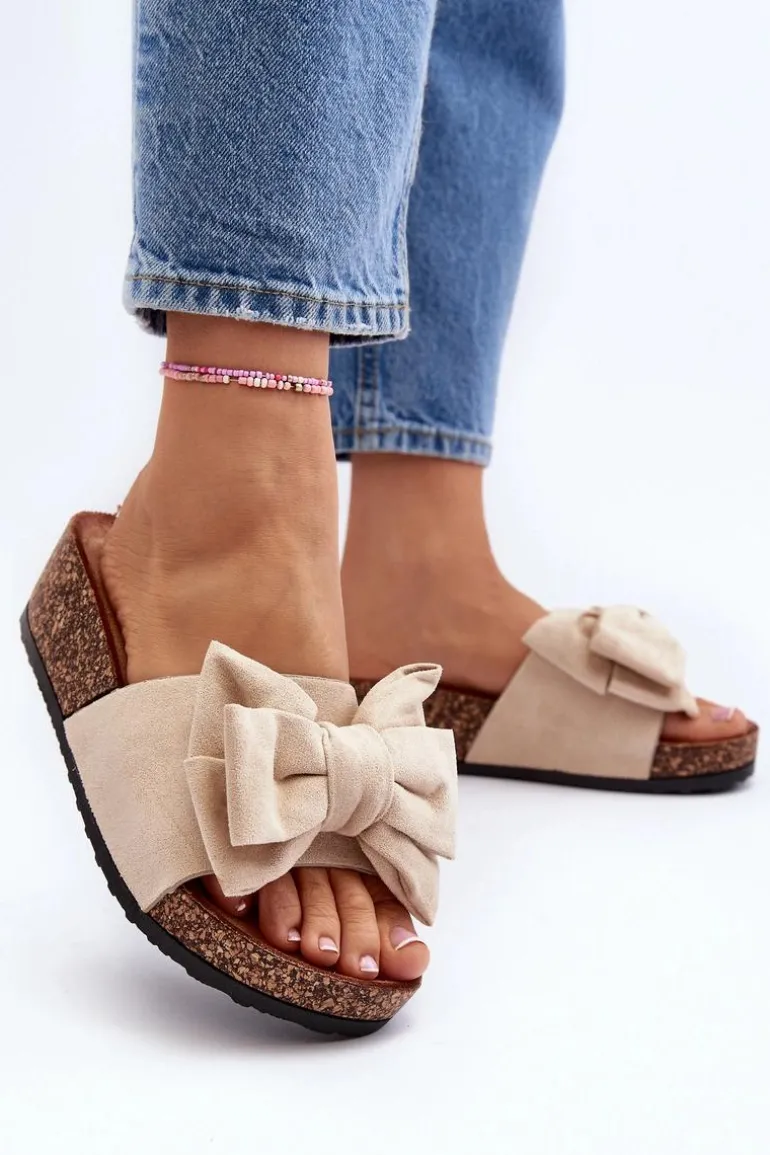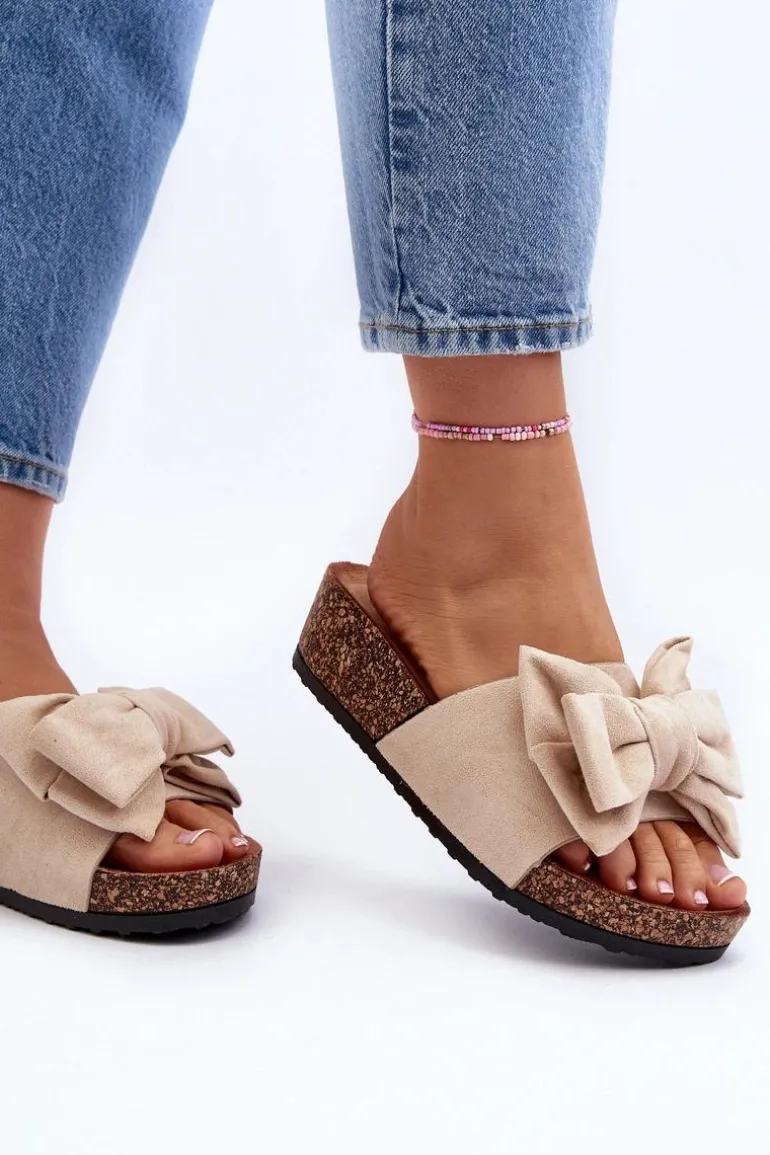 Klapki damskie na korkowej platformie. Buty posiadają lekko profilowaną wkładkę, która zagwarantuje komfort podczas użytkowania. Cholewka wykonana z przyjemnego w dotyku eko zamszu. Urocza kokarda na przodzie. Model ten idealnie sprawdzi się na co dzień, do pracy czy na zakupy. Idealne na upalne dni! Koniecznie powinnaś je mieć! Przy wyborze rozmiaru prosimy sugerować się tabelą rozmiarów.