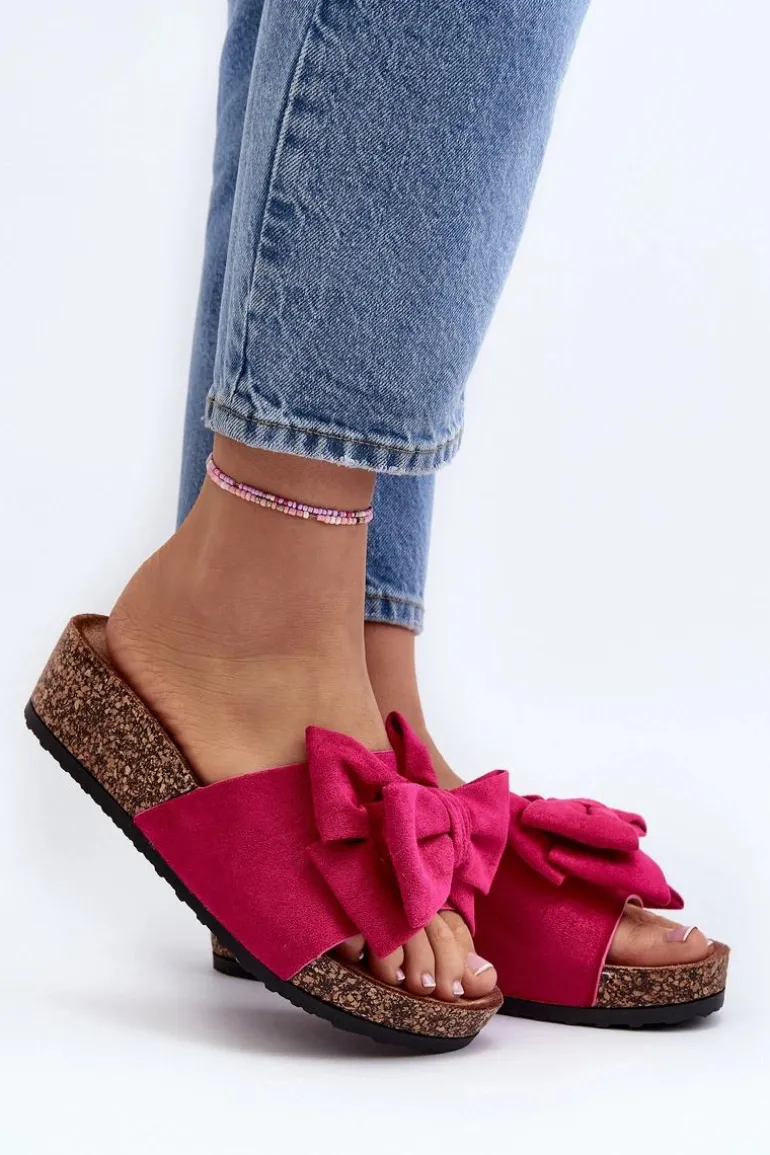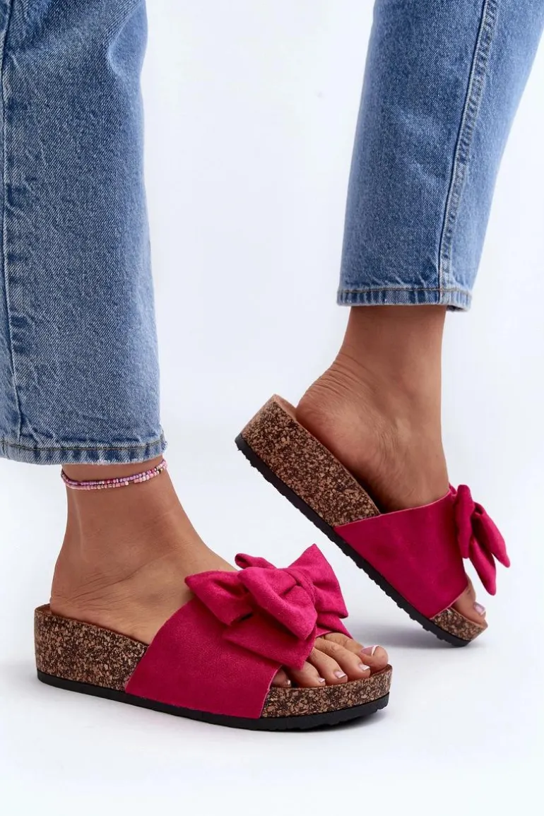 Klapki damskie na korkowej platformie. Buty posiadają lekko profilowaną wkładkę, która zagwarantuje komfort podczas użytkowania. Cholewka wykonana z przyjemnego w dotyku eko zamszu. Urocza kokarda na przodzie. Model ten idealnie sprawdzi się na co dzień, do pracy czy na zakupy. Idealne na upalne dni! Koniecznie powinnaś je mieć! Przy wyborze rozmiaru prosimy sugerować się tabelą rozmiarów.