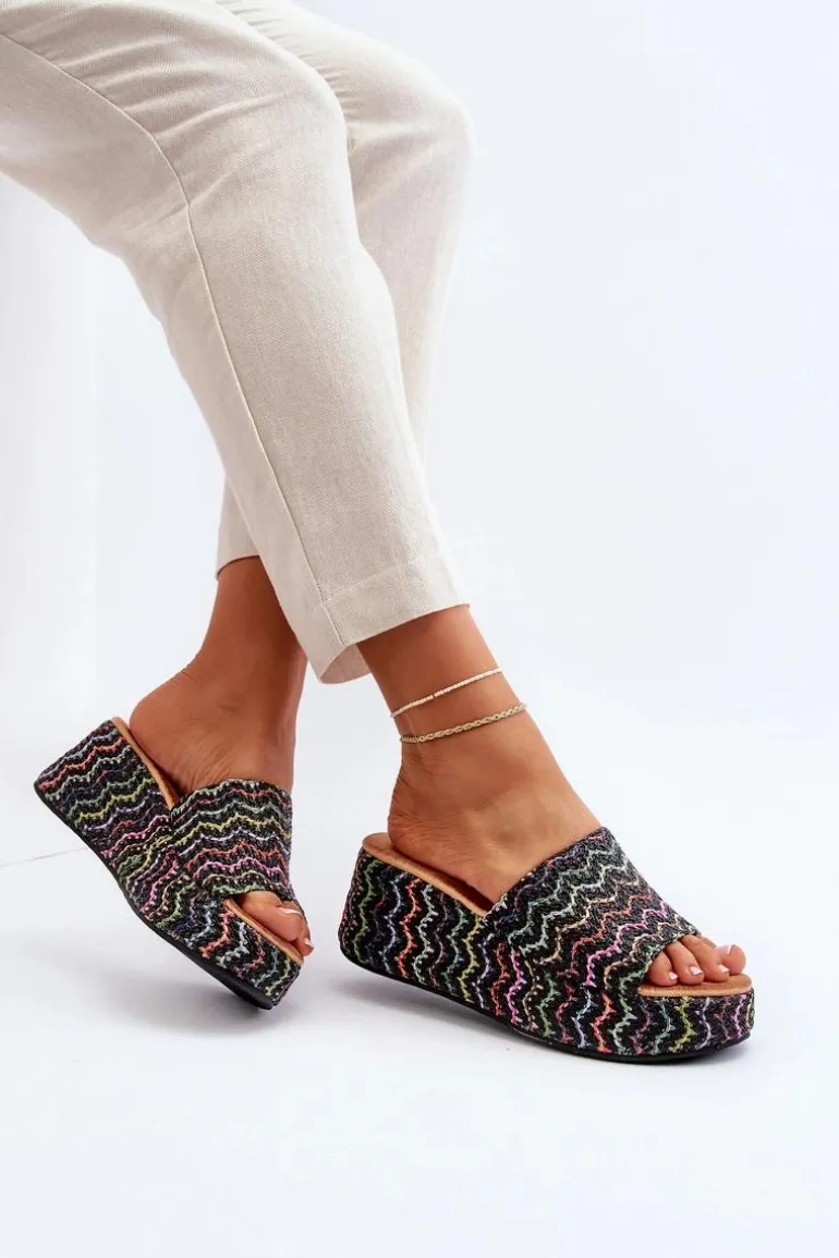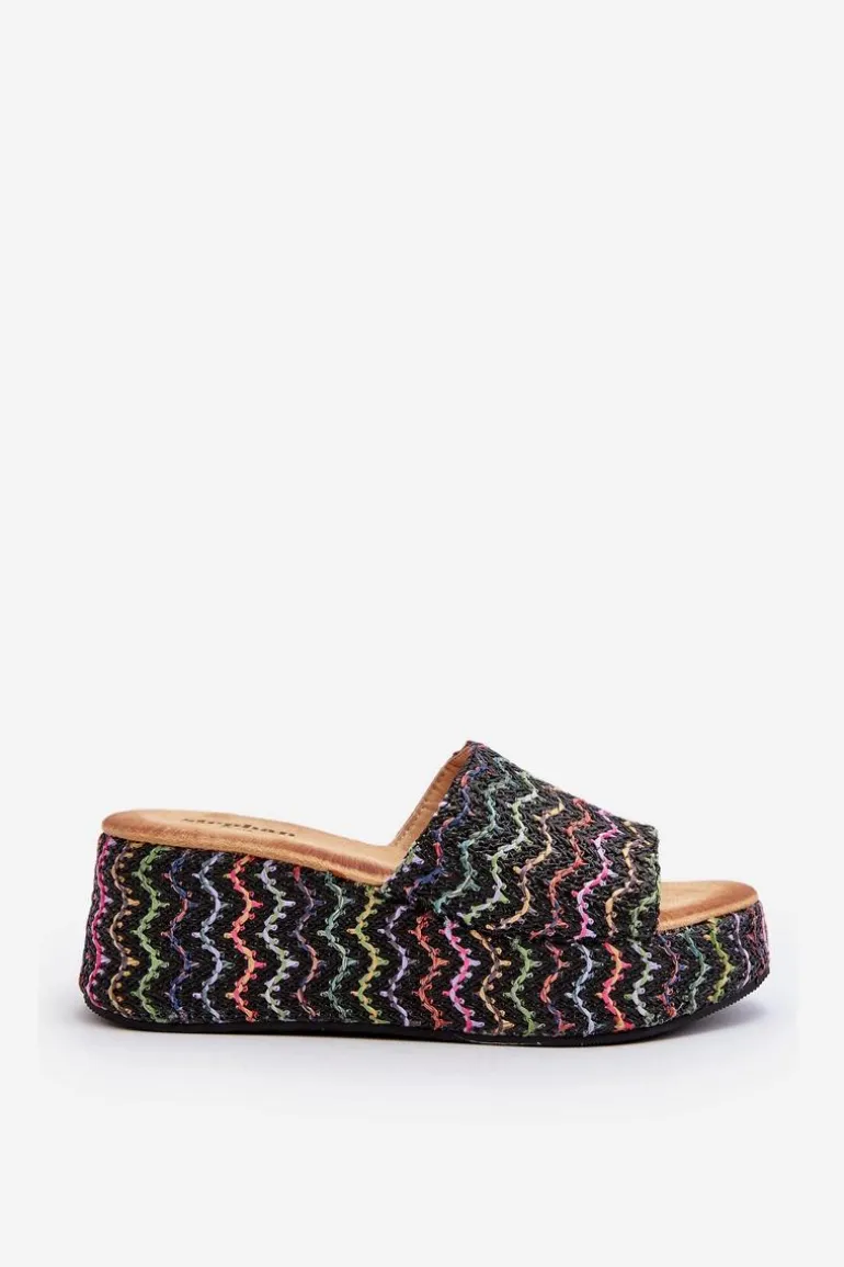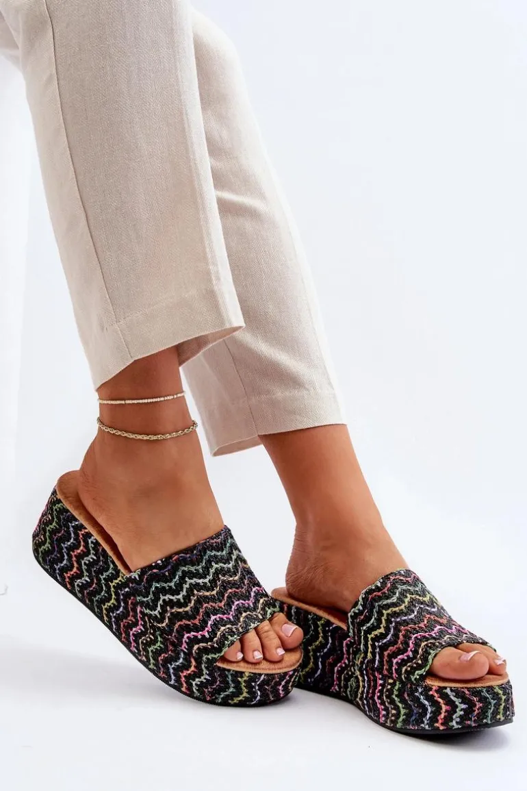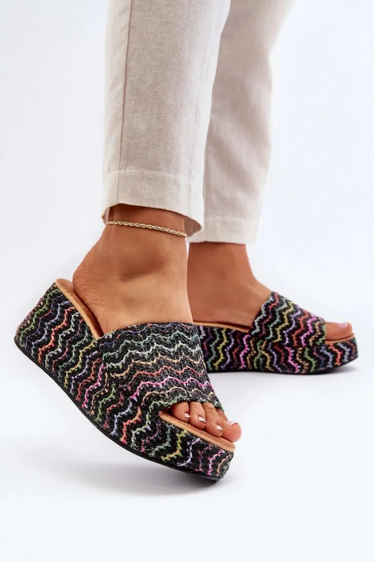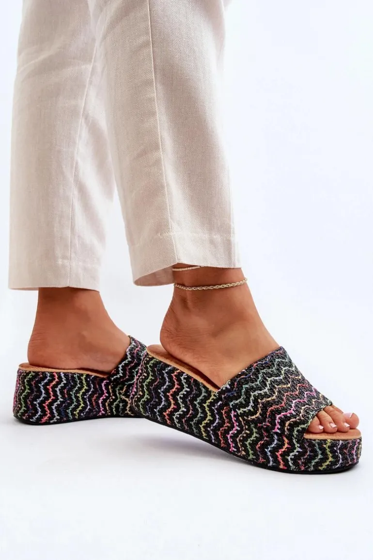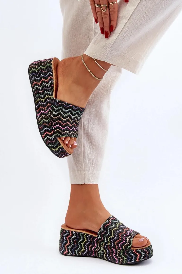 Damskie klapki zostały osadzone na masywnej platformie i koturnie, które dodatkowo zostały ozdobione plecionymi warkoczami. Miękka wkładka została wykonana z miękkiego eko zamszu. Te klapki to świetny wybór na letnie, upalne dni! Przy wyborze rozmiaru prosimy sugerować się tabelą rozmiarów.