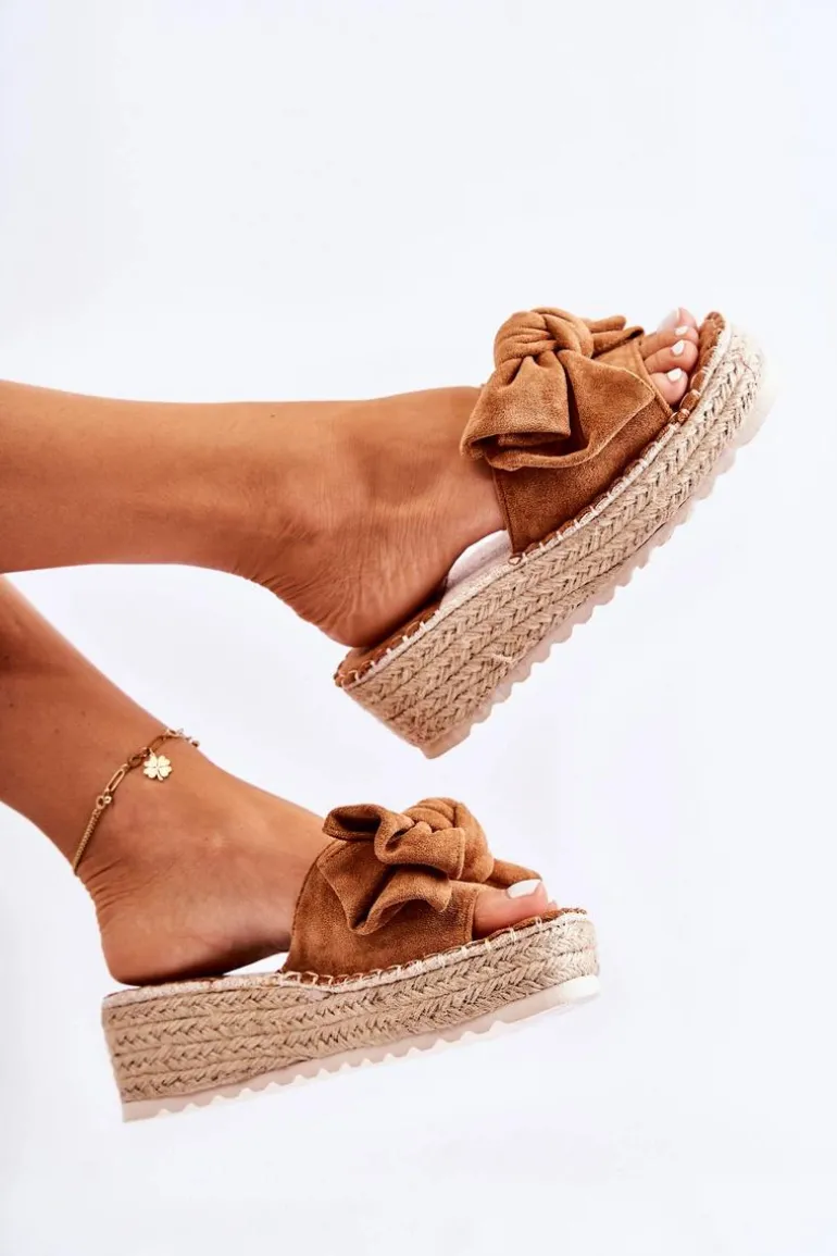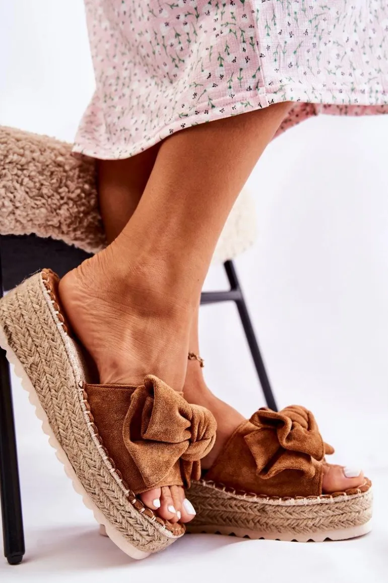 Wygodne klapki wykonane z wysokiej jakości eko zamszu. Wkładka wykonana z połączenia eko zamszu oraz tkaniny. Buty osadzone na platformie wraz z koturnem. Dodatkowo przyozdobione warkoczem z juty. Na przednim pasku znajduje się urocza kokarda. Podeszwa z tworzywa sztucznego. Model idealny na co dzień. Koniecznie powinnaś go mieć! Przy wyborze rozmiaru prosimy sugerować się tabelą rozmiarów.