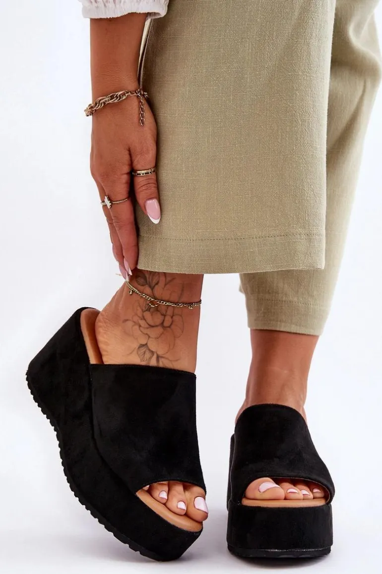 Wyjątkowe, damskie klapki zostały osadzone na masywnej platformie i koturnie. Wykonane z wierzchu z miłego w dotyku eko zamszu. Miękka wkładka została wykonana z eko skóry. Klapki posiadają odkryty nosek. Model ten posiada podeszwę z tworzywa sztucznego. Te klapki to świetny wybór na letnie, upalne dni! Przy wyborze rozmiaru prosimy sugerować się tabelą rozmiarów.