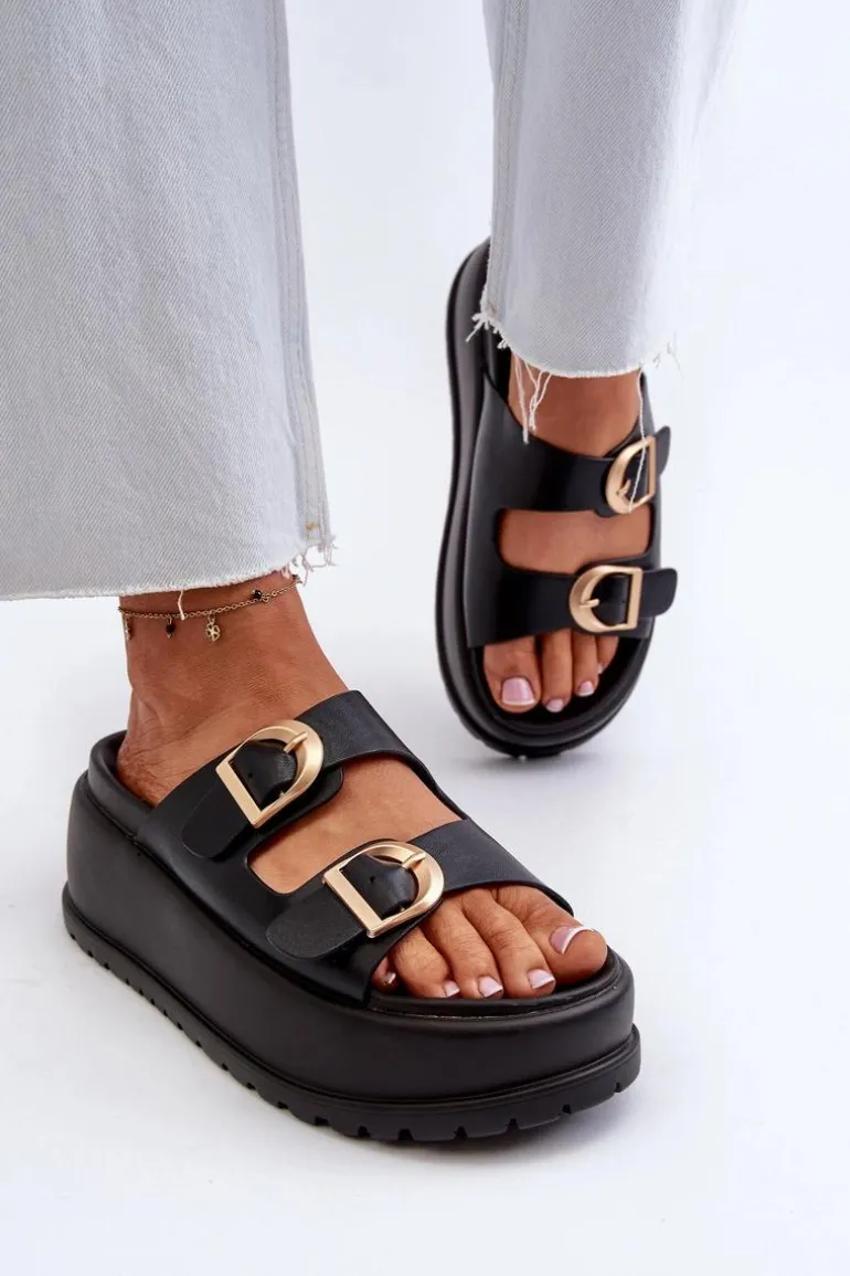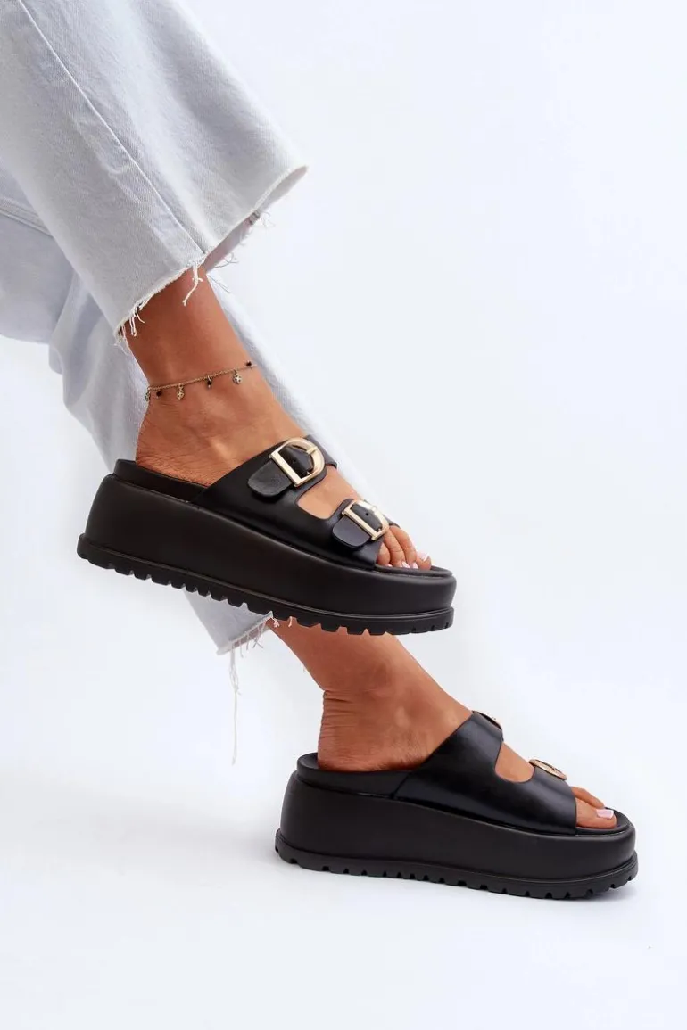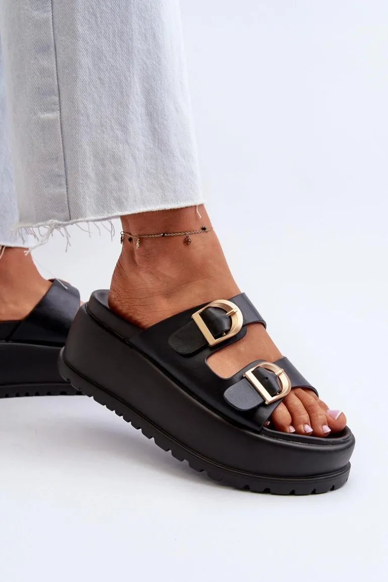 Klapki damskie na masywnej platformie to idealny wybór dla tych, którzy pragną połączyć wygodę z modnym stylem. Wykonane z eko skóry. Regulowane paski z klamrami sprawią, że łatwo dopasujesz je do tęgości stopy. Platforma zapewnia stabilność i wygodę noszenia przez cały dzień. Doskonałe na letnie spacery czy wieczorne wyjścia. Przy wyborze rozmiaru prosimy sugerować się tabelą rozmiarów.