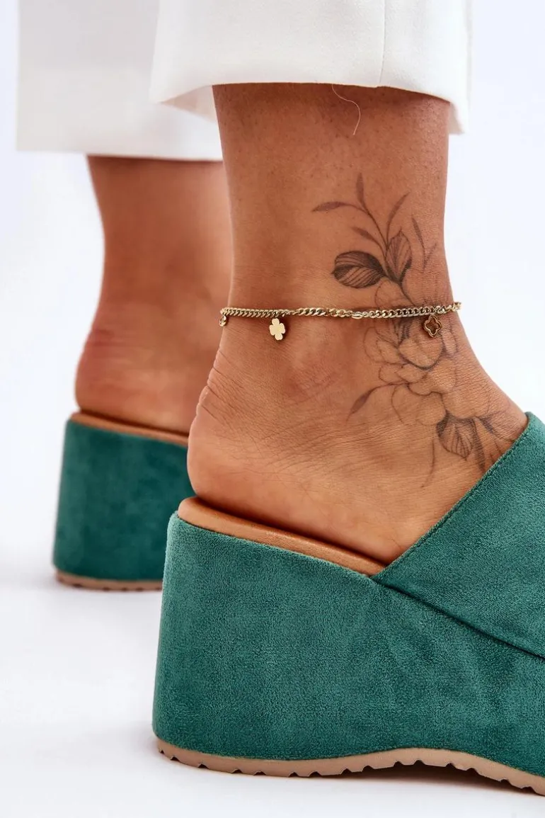 Wyjątkowe, damskie klapki zostały osadzone na masywnej platformie i koturnie. Wykonane z wierzchu z miłego w dotyku eko zamszu. Miękka wkładka została wykonana z eko skóry. Klapki posiadają odkryty nosek. Model ten posiada podeszwę z tworzywa sztucznego. Te klapki to świetny wybór na letnie, upalne dni! Przy wyborze rozmiaru prosimy sugerować się tabelą rozmiarów.
