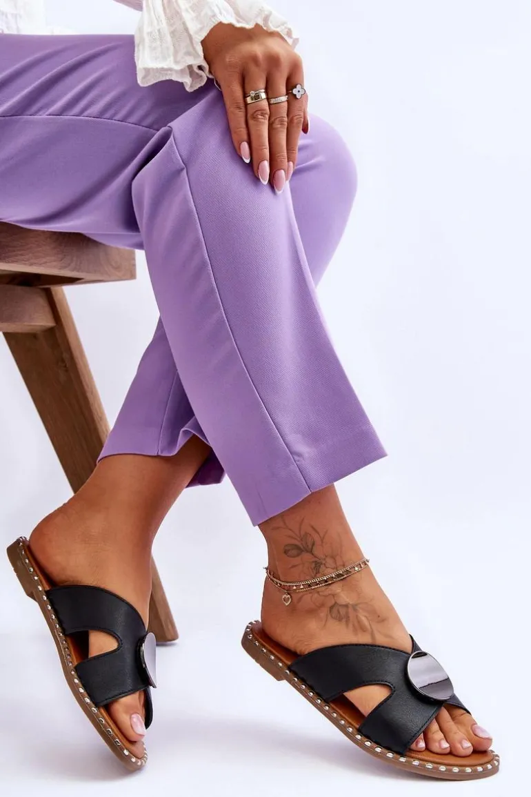 Damskie, klasyczne klapki zostały wykonane z wysokiej jakości eko skóry. Model ten posiada wycięcia po bokach oraz ozdobę w kształcie koła na środku. Klapki są wsuwane i osadzone na płaskim obcasie. Dodatkowo podeszwa została ozdobiona ćwiekami. Miękka wkładka została także wykonana z eko skóry. Przy wyborze rozmiaru prosimy sugerować się tabelą rozmiarów.