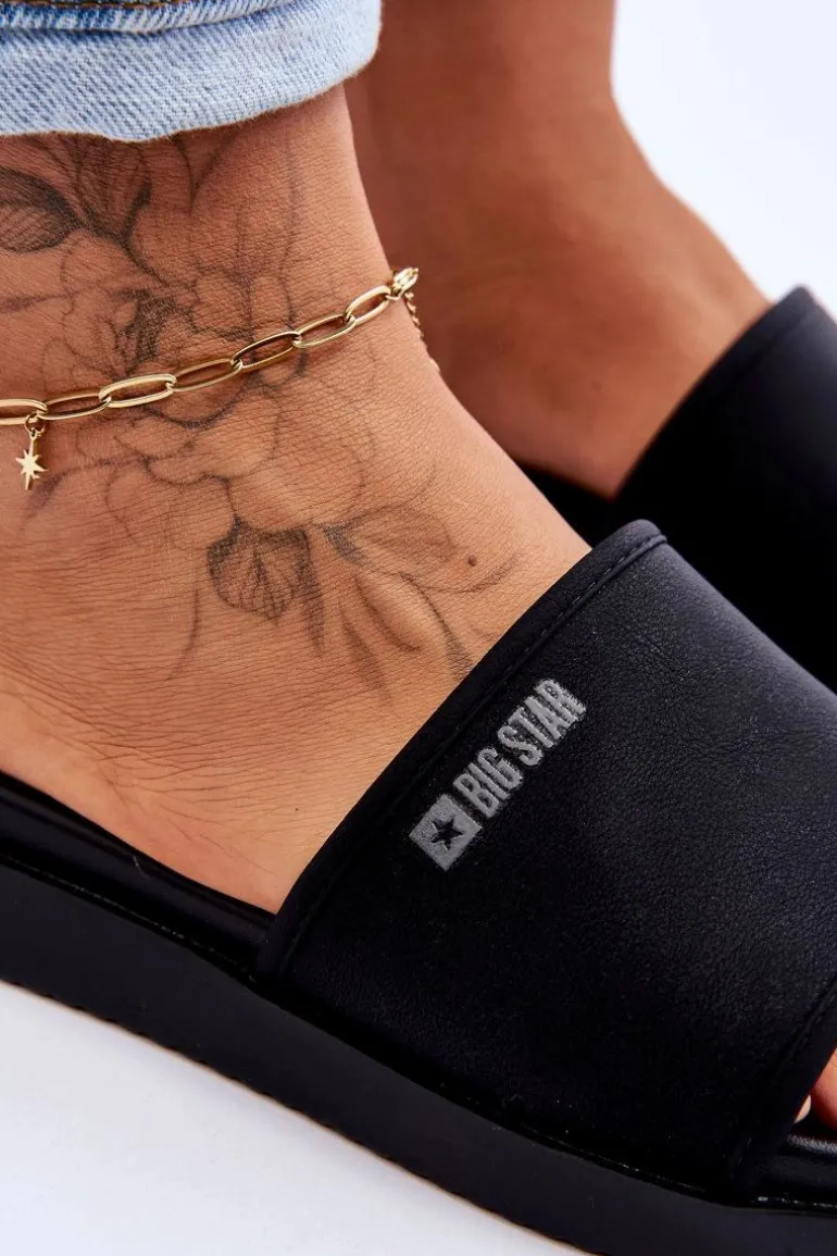 Klasyczne klapki marki Big Star zostały wykonane z eko skóry. Model ten posiada lekko uniesiony nosek oraz platformę z tworzywa sztucznego. Na wierzchu oraz na wkładce znajduje się logo. Dodatkowo tylna część została ozdobiona lustrzanym elementem. Koniecznie powinnaś je mieć! Przy wyborze rozmiaru prosimy sugerować się tabelą rozmiarów.