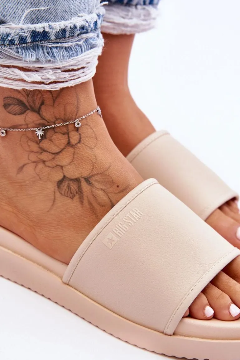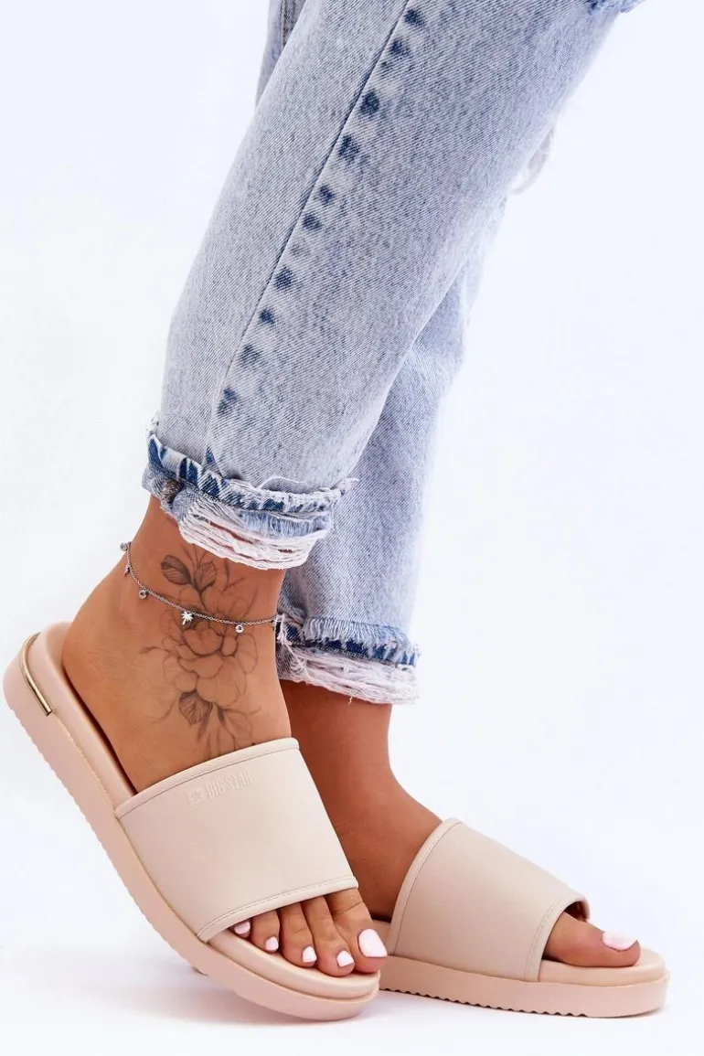 Klasyczne klapki marki Big Star zostały wykonane z eko skóry. Model ten posiada lekko uniesiony nosek oraz platformę z tworzywa sztucznego. Na wierzchu oraz na wkładce znajduje się logo. Dodatkowo tylna część została ozdobiona lustrzanym elementem. Koniecznie powinnaś je mieć! Przy wyborze rozmiaru prosimy sugerować się tabelą rozmiarów.