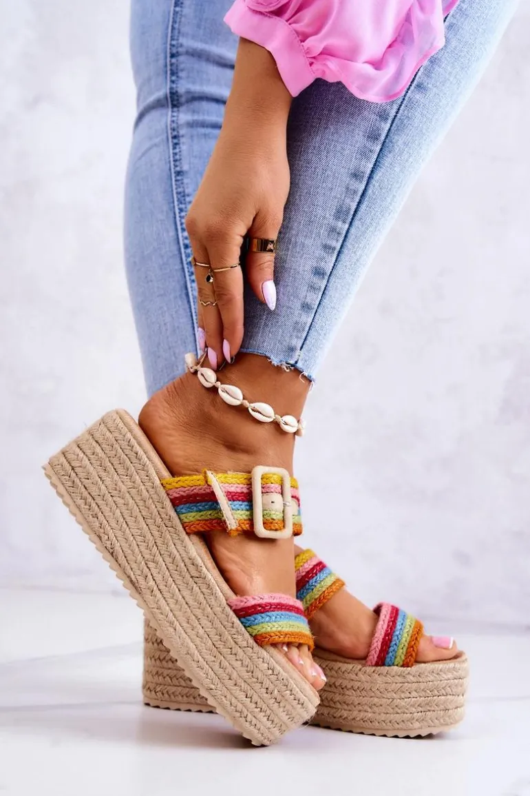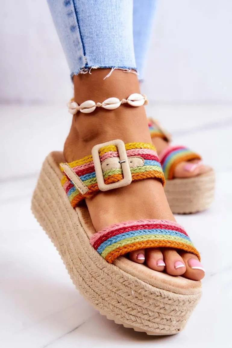 Klapki wykonane z jutowej tkaniny w ciekawy wzór. Posiadają masywną platformę, która delikatnie uniesie Twoją sylwetkę. Podeszwa wykonana z piankowego tworzywa, a platforma opleciona jutowym warkoczem. Dodatkowo jeden pasek można regulować za pomocą sprzączki. Miękka i wygodna wkładka świetnie sprawdzi się przy całodziennym użytkowaniu. Model, który zachwyci niejedną wielbicielkę stylu boho! Przy wyborze rozmiaru prosimy kierować się tabelą rozmiarów.
