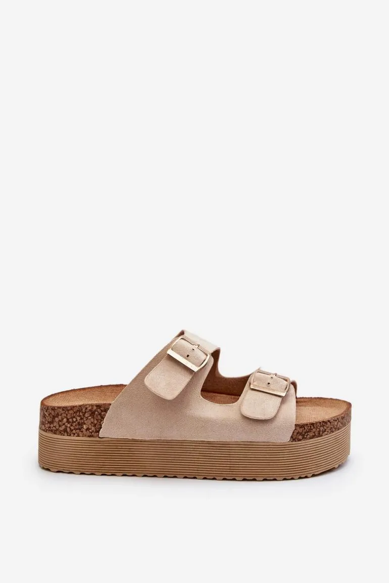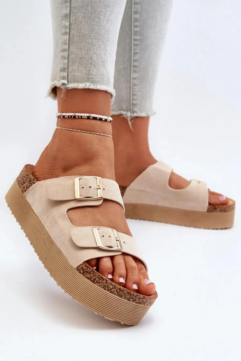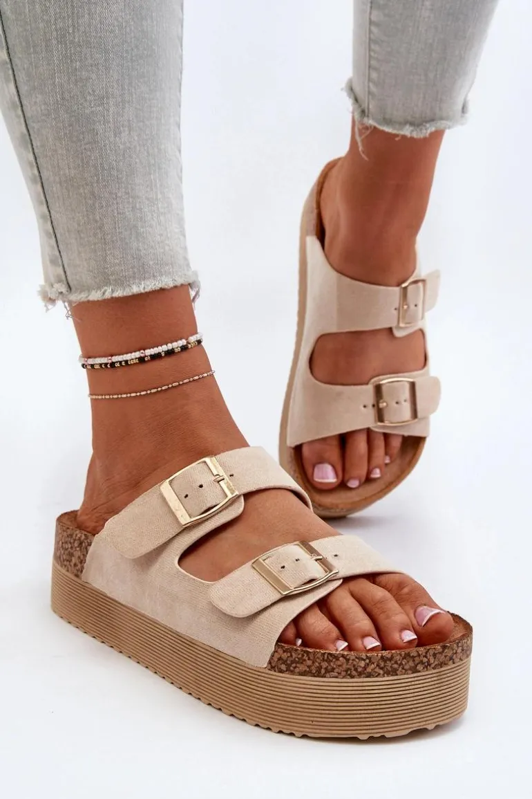 Damskie Klapki Na Platformie Z Klamrami Beżowe Lolpey