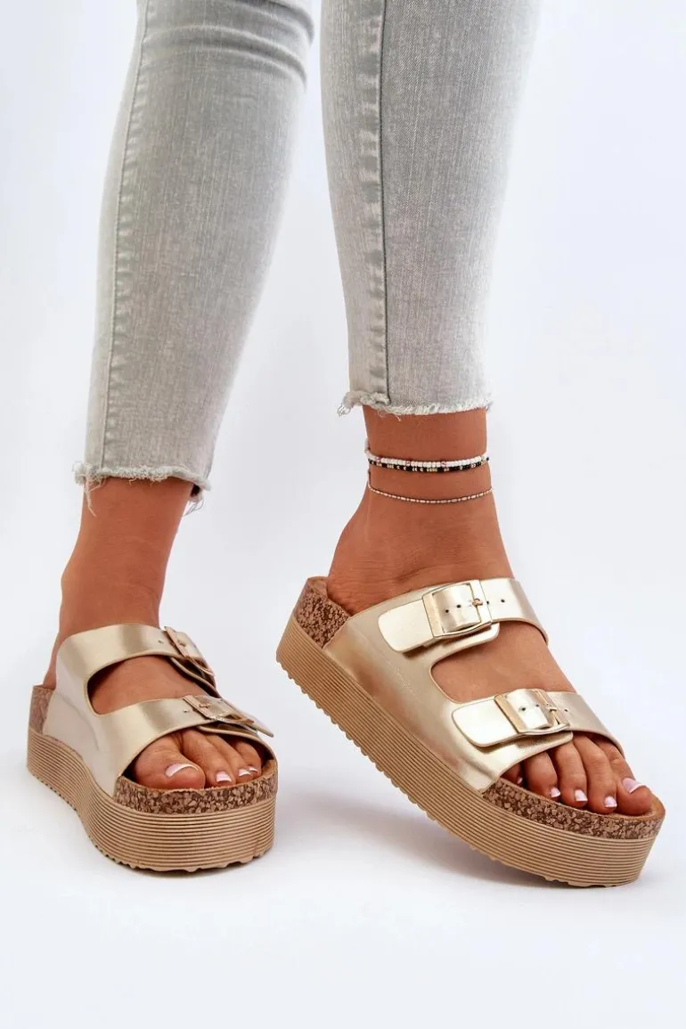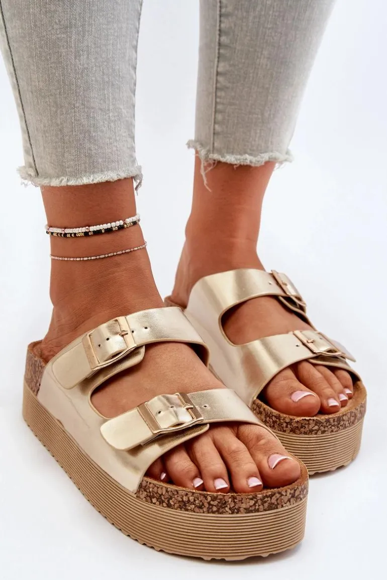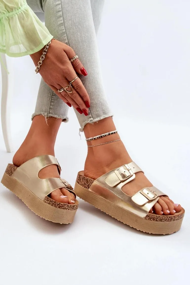 Klapki damskie osadzone na masywnej platformie. Model ten posiada dwa paski, które można regulować za pomocą sprzączek, zapewniając idealne dopasowanie. Dzięki profilowanej wkładce wykonanej z eko zamszu będą wygodne podczas noszenia nawet przez cały dzień. Doskonałe na letnie spacery i codzienne wyjścia na zakupy. Przy wyborze rozmiaru prosimy sugerować się tabelą rozmiarów.