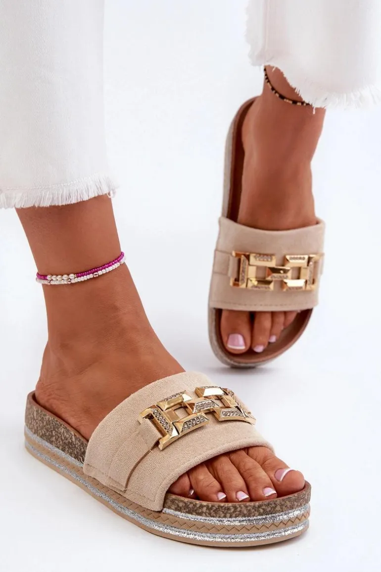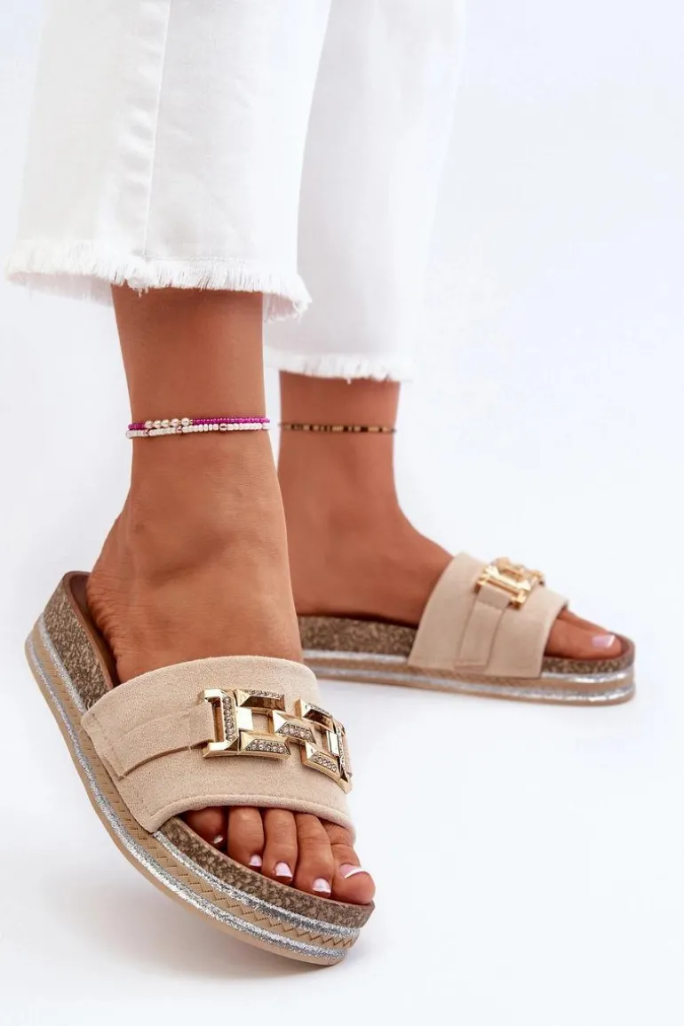Damskie Klapki Na Platformie Z Ozdobą Beżowe Vapireta