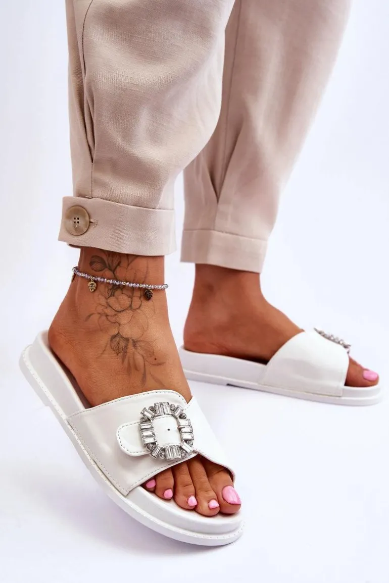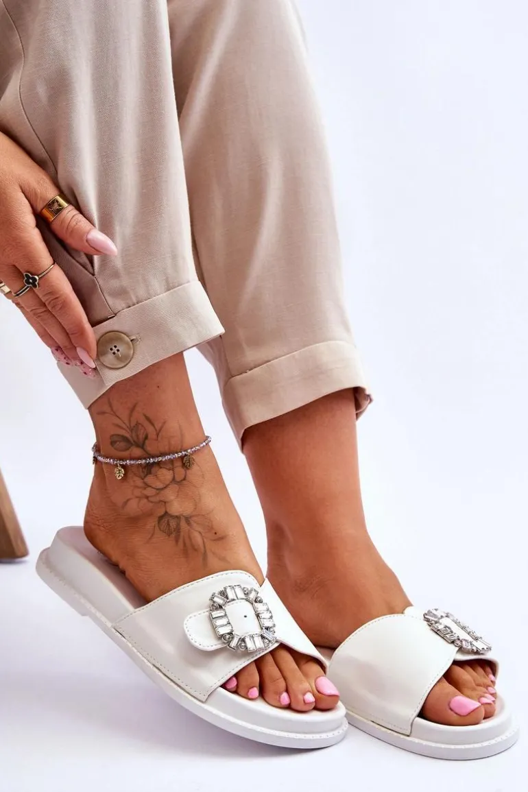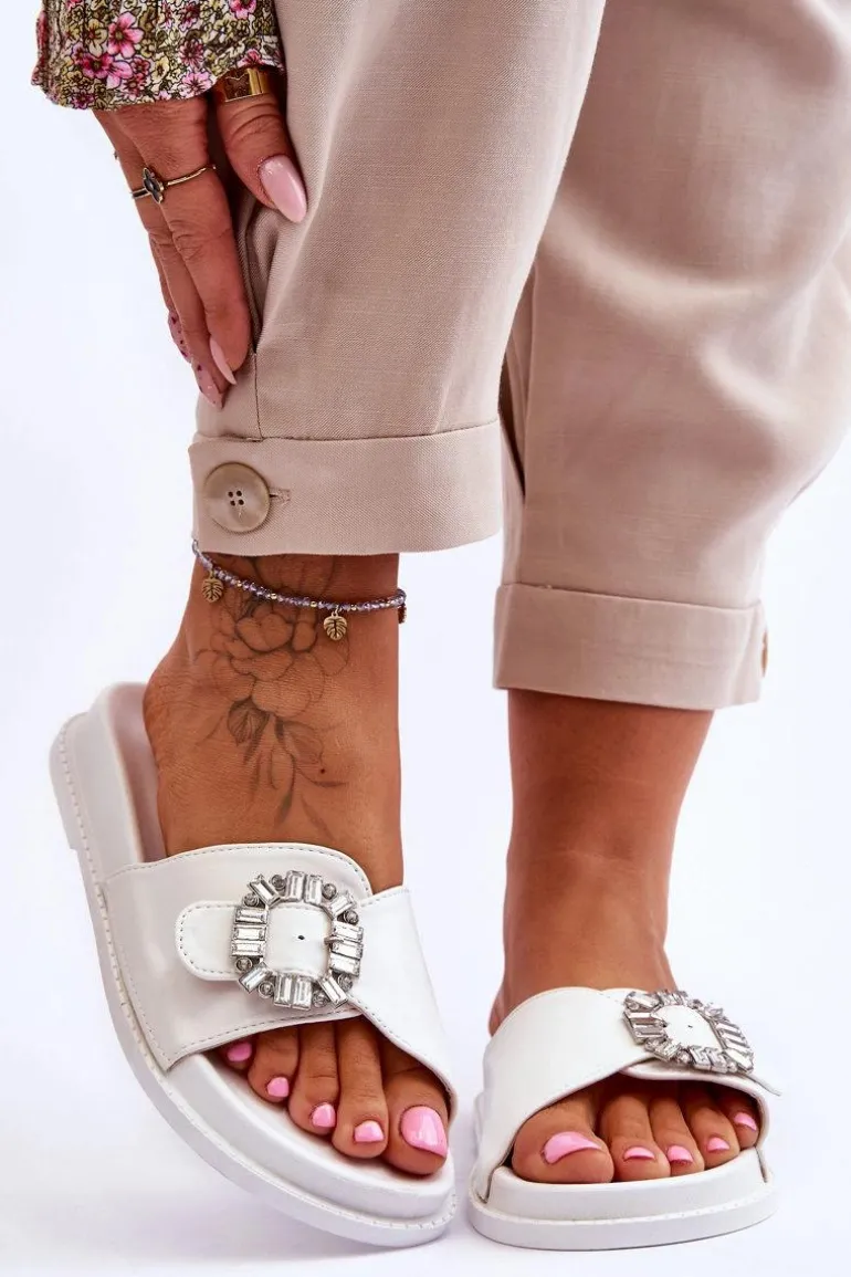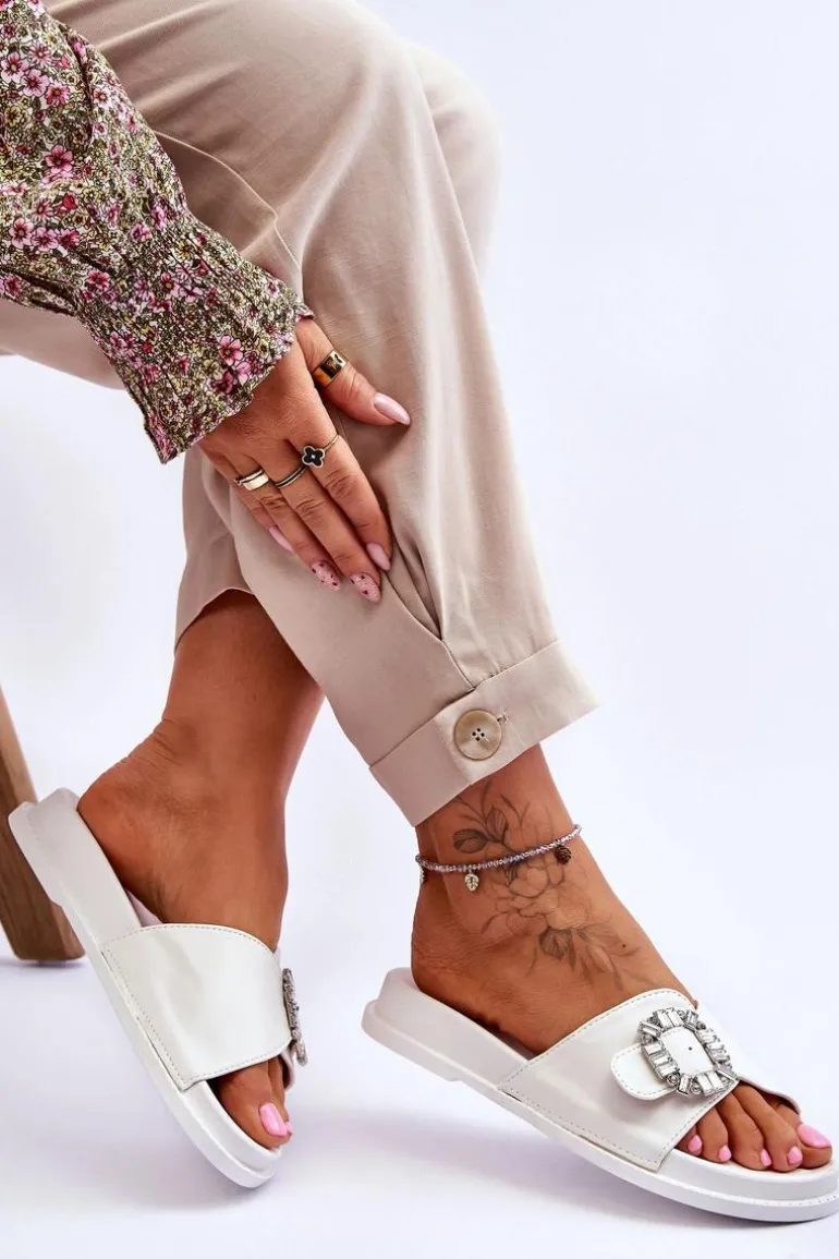Klapki damskie zostały wykonane z eko skóry. Model ten posiada pasek zapinany na sprzączkę, który można regulować. Ozdobna klamra dodaje elegancji. Klapki są idealne na letnie spacery oraz codzienne wyjścia na zakupy. Wkładka wraz z podeszwą zostały wykonane z tworzywa sztucznego. Przy wyborze rozmiaru prosimy sugerować się tabelą rozmiarów.