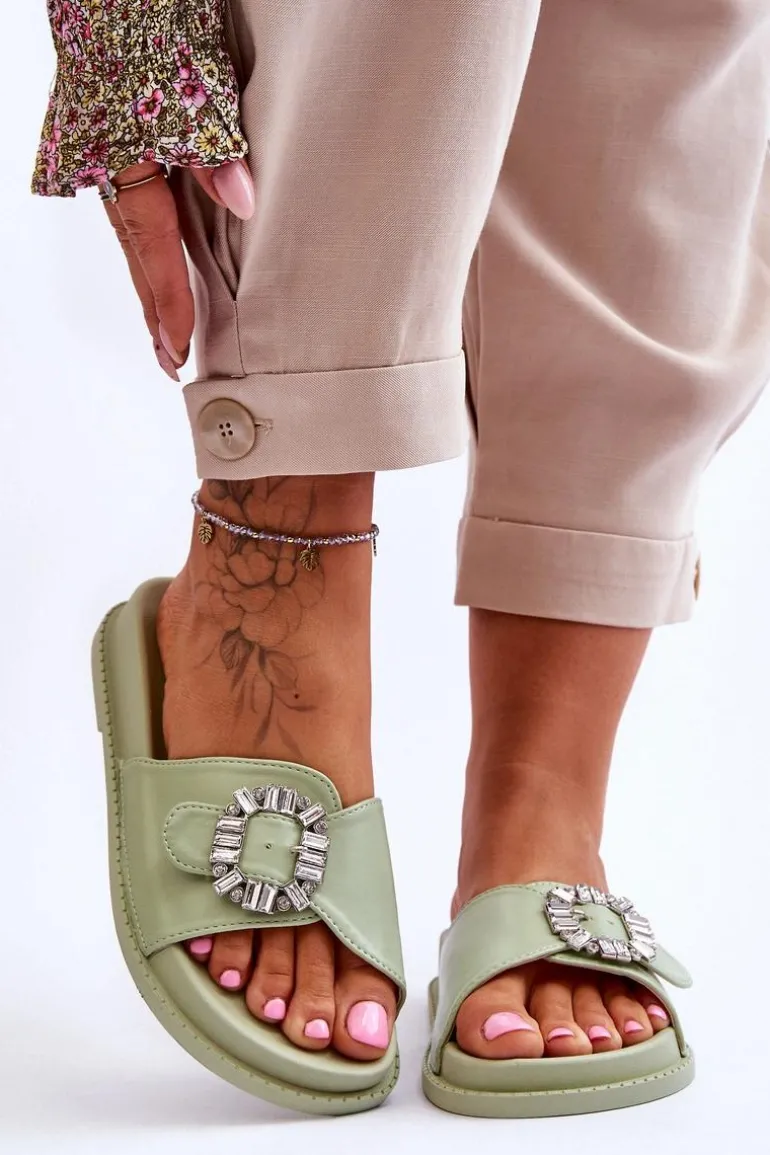 Klapki damskie zostały wykonane z eko skóry. Model ten posiada pasek zapinany na sprzączkę, który można regulować. Ozdobna klamra dodaje elegancji. Klapki są idealne na letnie spacery oraz codzienne wyjścia na zakupy. Wkładka wraz z podeszwą zostały wykonane z tworzywa sztucznego. Przy wyborze rozmiaru prosimy sugerować się tabelą rozmiarów.