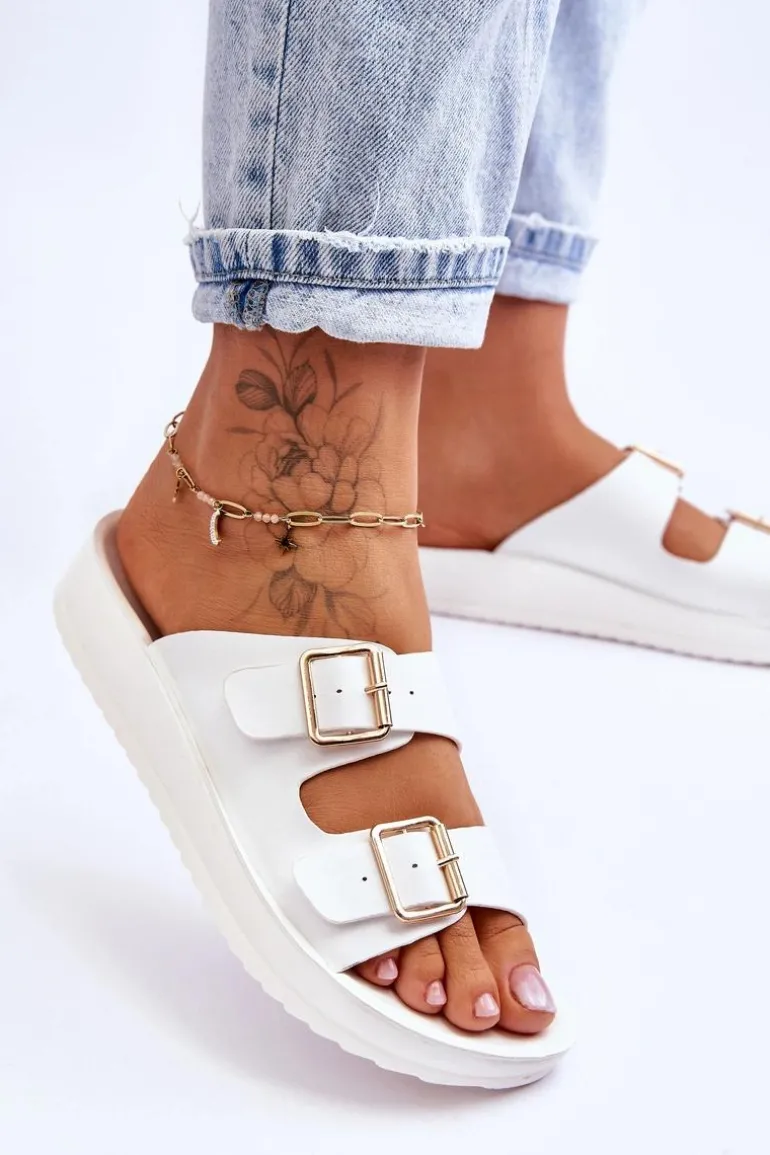 Klasyczne, damskie buty zostały wykonane z eko skóry. Posiadają ozdobną klamrę z regulowanymi paskami. Model ten został osadzony na platformie z tworzywa sztucznego. Idealne obuwie na letni sezon. Klapki te są niezwykle przewiewne i wygodne. Koniecznie powinnaś je mieć! Przy wyborze rozmiaru prosimy sugerować się tabelą rozmiarów.