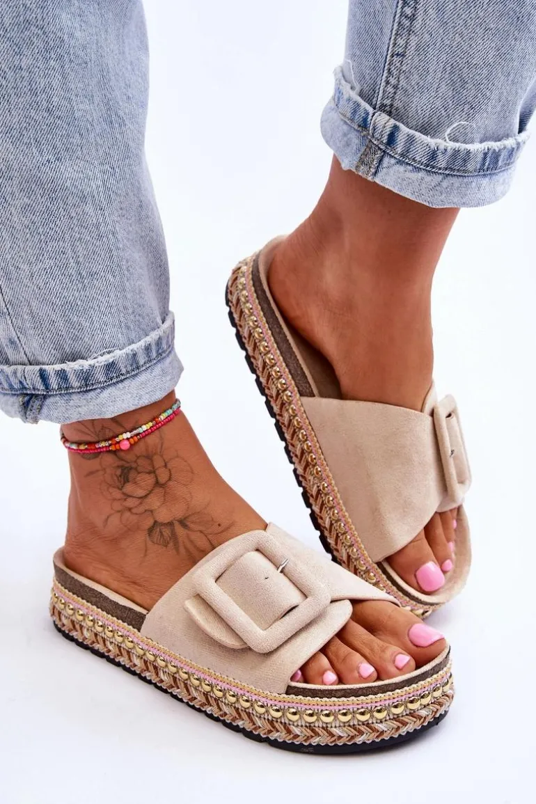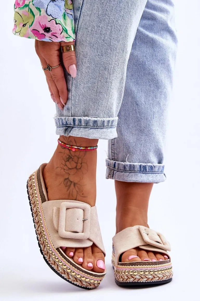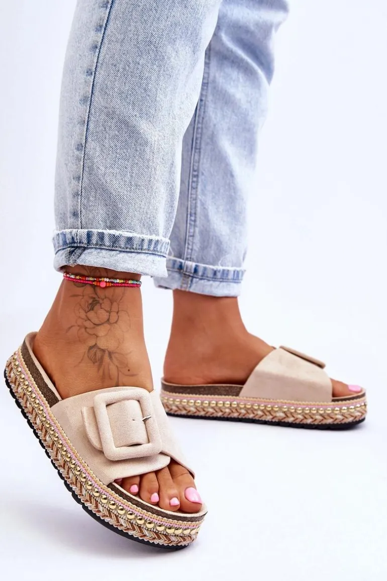 Damskie Klapki Na Zdobionej Platformie Beżowe Joyce