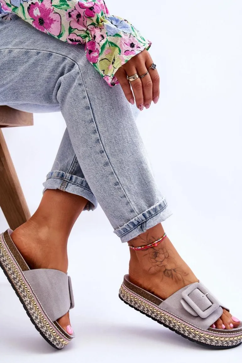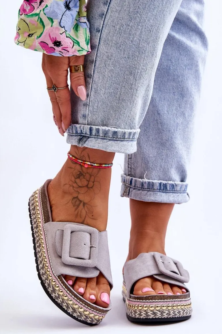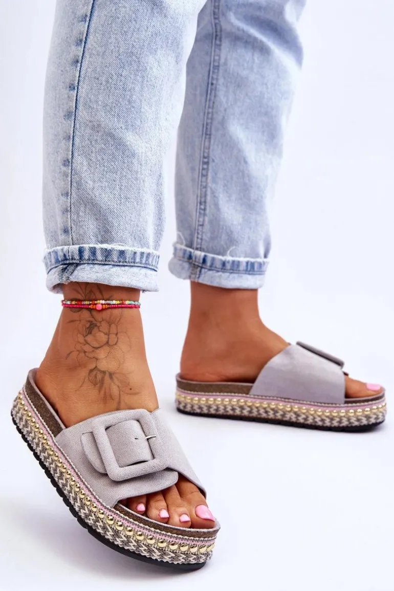 Wyjątkowe, damskie klapki zostały osadzone na platformie ozdobionej nitami oraz kolorowymi plecionkami. Model klasyczny, wsuwany, ozdobną klamrą i regulowanym paskiem, który pozwoli na odpowiednie dopasowanie obuwia do tęgości nogi. Profilowana wkładka zapewni wygodę w użytkowaniu. Świetny model do wielu stylizacji! Przy wyborze rozmiaru prosimy sugerować się tabelą rozmiarów.