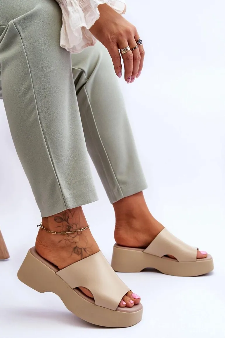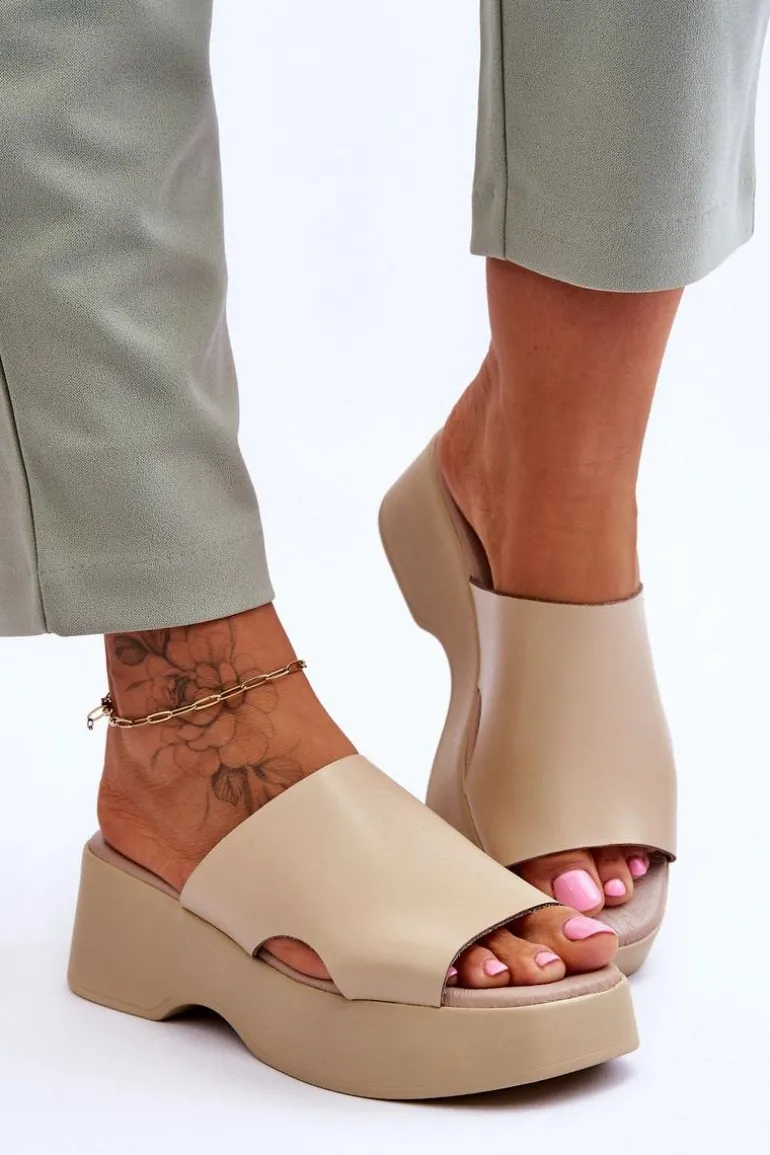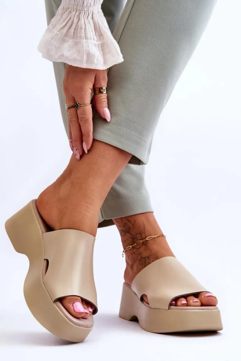 Damskie, klasyczne klapki zostały wykonane z naturalnej skóry z wycięciami. Osadzone na płaskim obcasie z ozdobioną podeszwą. Model ten z pewnością przypadnie do gustu każdej kobiecie ceniącej sobie styl oraz wygodę. Miękka, skórzana wkładka pozwoli na komfortowe użytkowanie obuwia nawet przez cały dzień. Przy wyborze rozmiaru prosimy sugerować się tabelą rozmiarów.