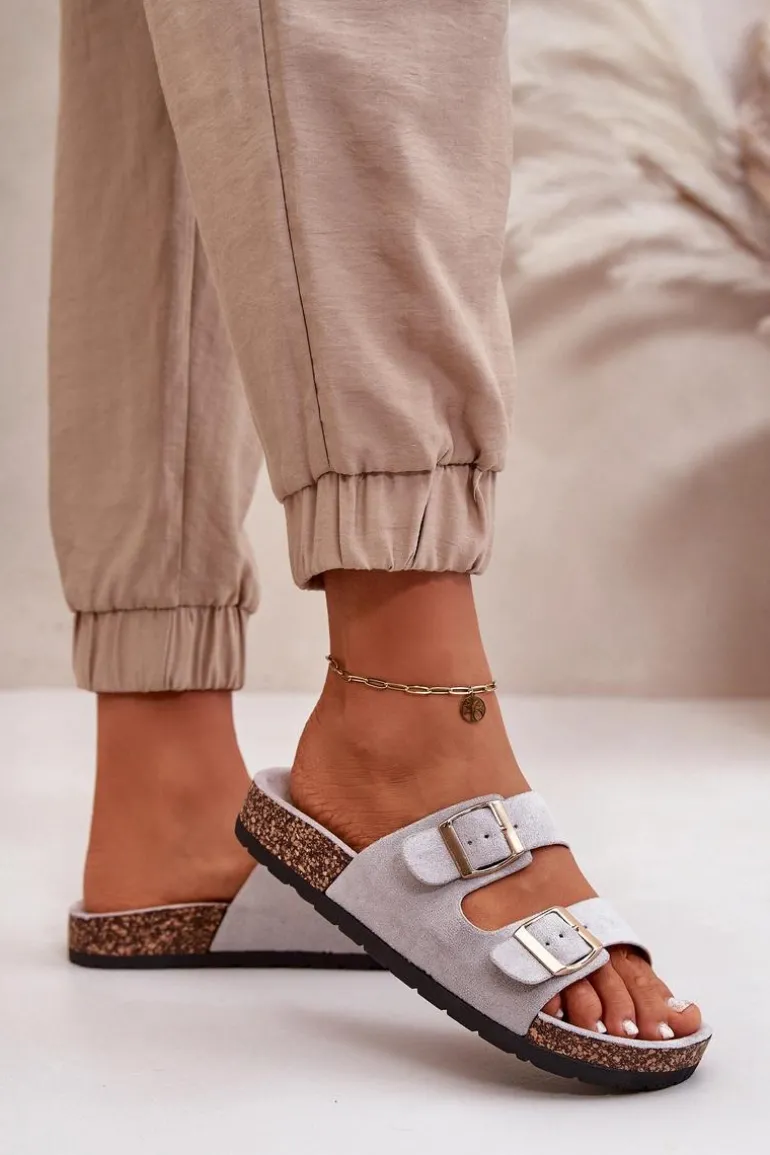 Klapki te posiadają dwa szerokie paski zapinane na sprzączkę, które można regulować. Idealne na letnie spacery oraz codzienne wyjścia na zakupy. Profilowana, wykonana z eko zamszu wkładka zapewni wygodę oraz komfort. Podeszwa została wykonana z tworzywa sztucznego. Klapki te sprawiają, że Twoje stopy będą wypoczęte i zrelaksowane. Przy wyborze rozmiaru prosimy sugerować się tabelą rozmiarów.