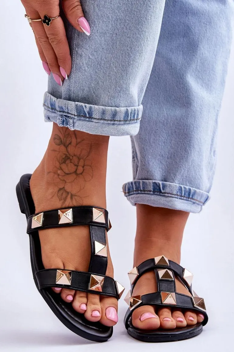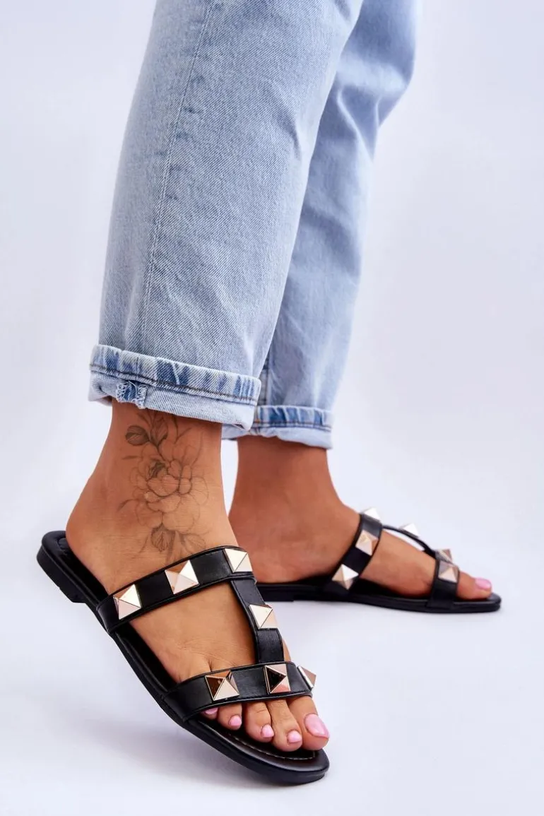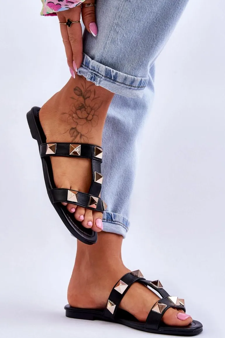 Damskie, klasyczne klapki zostały wykonane z eko skóry. Posiadają modne wycięcia na bokach. Dodatkowo zostały ozdobione dużymi ćwiekami. Klapki osadzono na płaskim obcasie z gumową, antypoślizgową podeszwą. Model ten z pewnością przypadnie do gustu każdej kobiecie podczas upalnych dni. Miękka, eko skórzana wkładka pozwoli na komfortowe użytkowanie obuwia nawet przez cały dzień. Przy wyborze rozmiaru prosimy sugerować się tabelą rozmiarów.