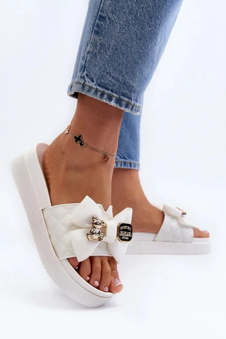 Damskie klapki wykonane z eko skóry. Osadzone na masywnej platformie. Model ten posiada materiałową kokardę i imitację agrafki z misiem i blaszką z napisem. Idealne klapki na nadchodzący sezon! Koniecznie powinnaś je mieć! Przy wyborze rozmiaru prosimy sugerować się tabelą rozmiarów.