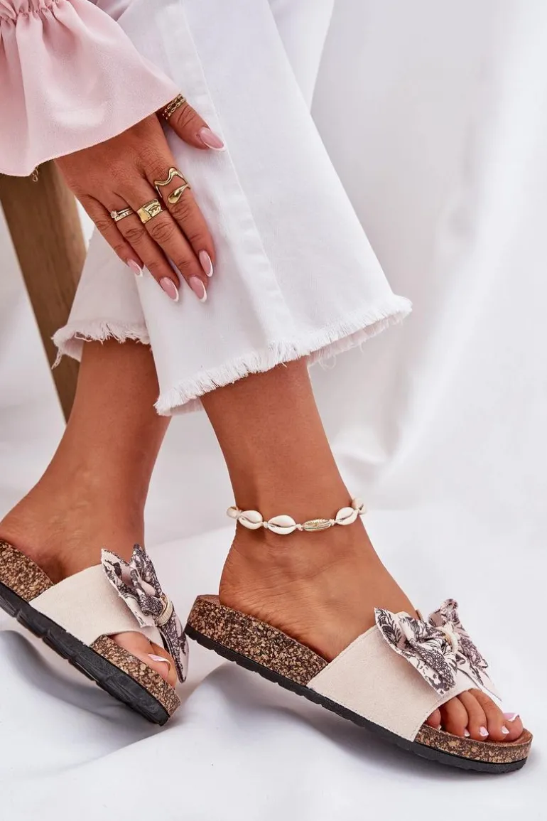 Stylowe klapki z korkową podeszwą charakteryzują się profilowaną wkładką. Wykonane z eko zamszu i materiału tekstylnego. Przód zdobi kokarda. Klapki są uniwersalne i doskonale nadają się do codziennych aktywności, pracy czy zakupów. To idealny wybór na letnie dni! Przy wyborze rozmiaru prosimy sugerować się tabelą rozmiarów.