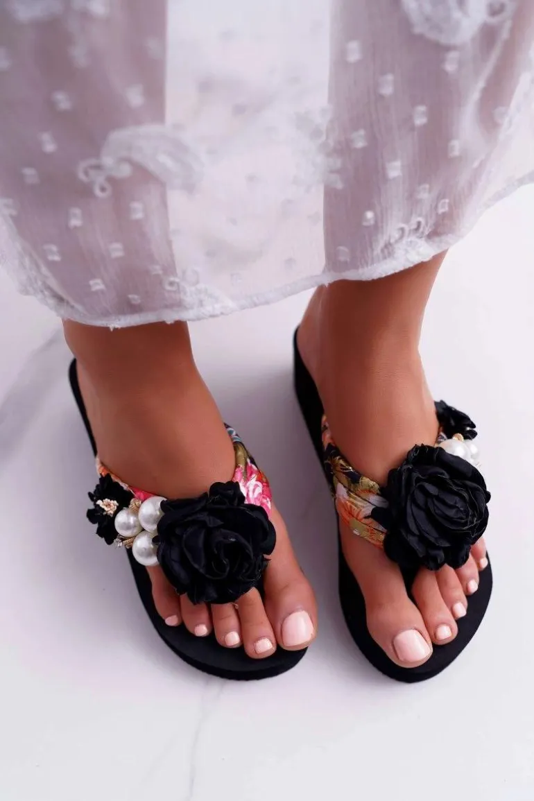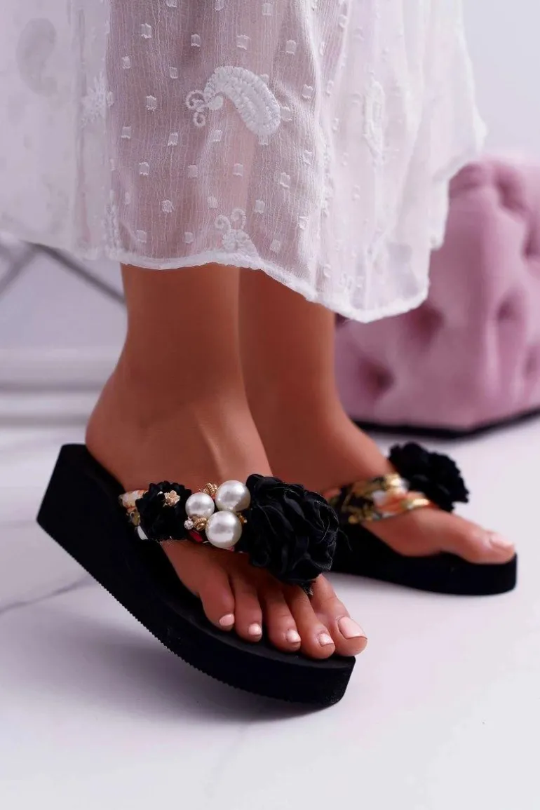 Damskie Klapki Z Kwiatem Japonki Na Koturnie Czarne Sharme