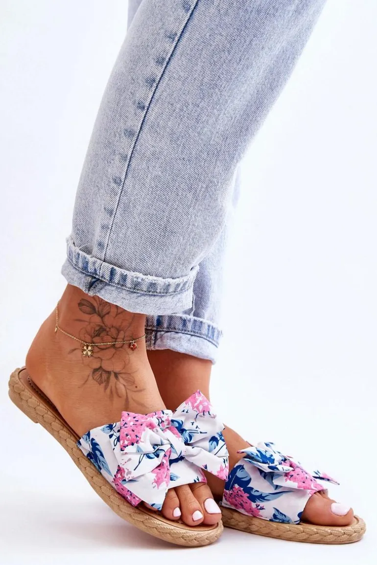 Piękne, damskie klapki zostały wykonane z zewnątrz z materiału tekstylnego w kwiecisty wzór. Klapki zostały wykonane z gumowego tworzywa. Osadzone na płaskim obcasie. Model ten jest wsuwany. Klapki cudnie będą prezentować się z sukienkami czy spódniczkami. Idealne obuwie na upalne dni! Przy wyborze rozmiaru prosimy sugerować się tabelą rozmiarów.