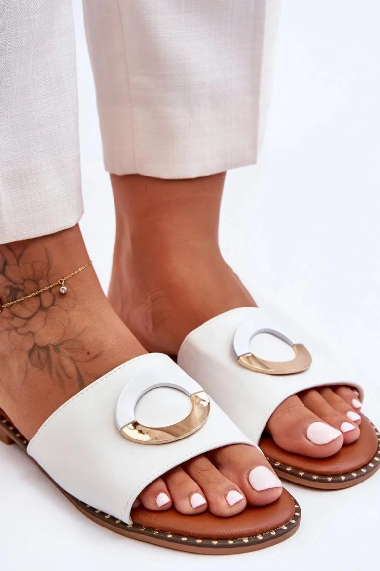 Damskie klapki zostały wykonane z eko skóry. Posiadają na przodzie ozdobę w postaci koła. Klapki osadzono na płaskim obcasie i antypoślizgowej, gumowej podeszwie. Wkładka jest niezwykle miękka i wygodna w użytkowaniu, co zwiększa komfort użytkowania. Nosek w tych klapkach jest odkryty i lekko zaokrąglony. Dodatkowo przy podeszwie znajdują się ozdobne ćwieki. Przy wyborze rozmiaru prosimy sugerować się tabelą rozmiarów.