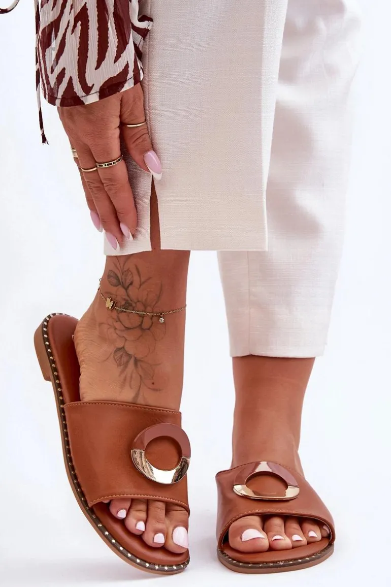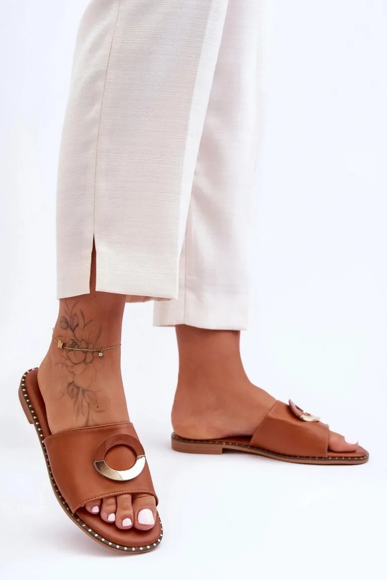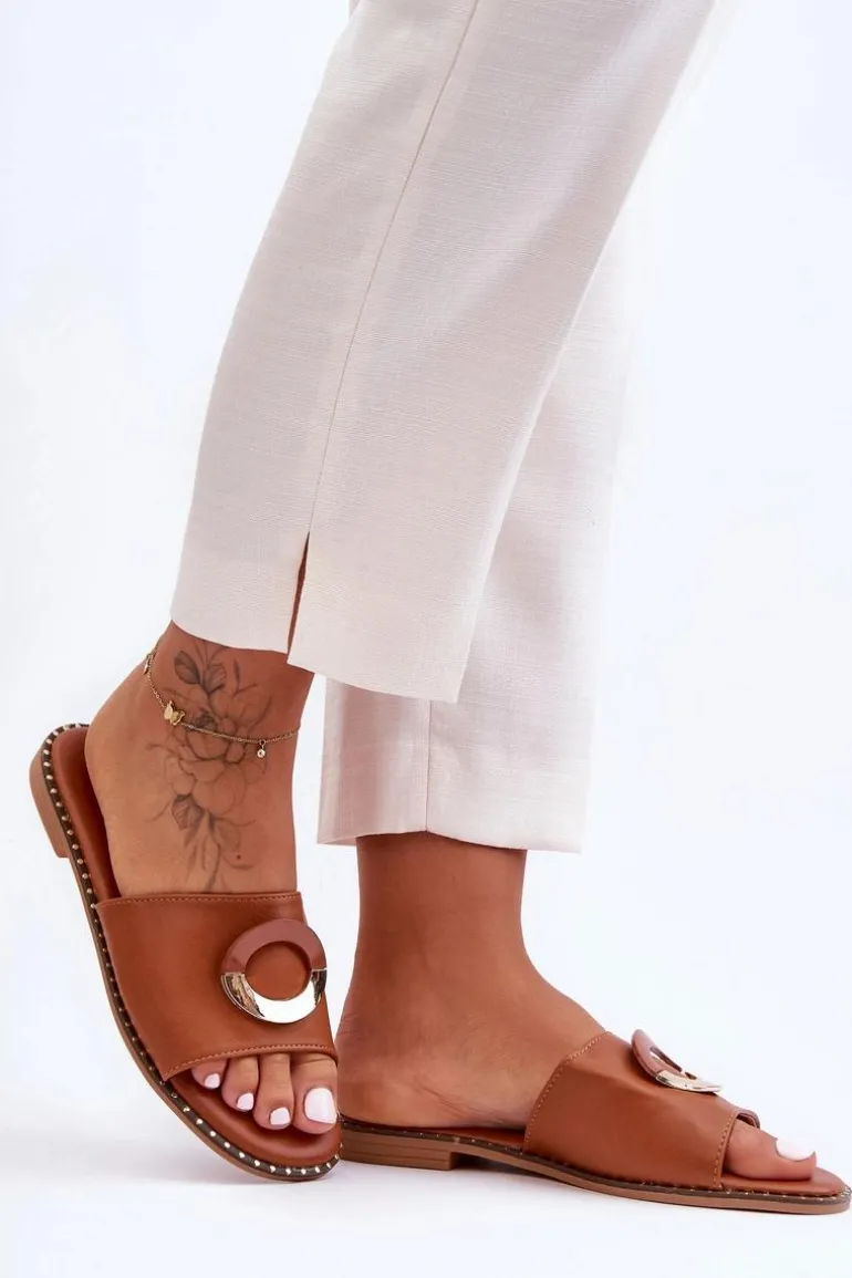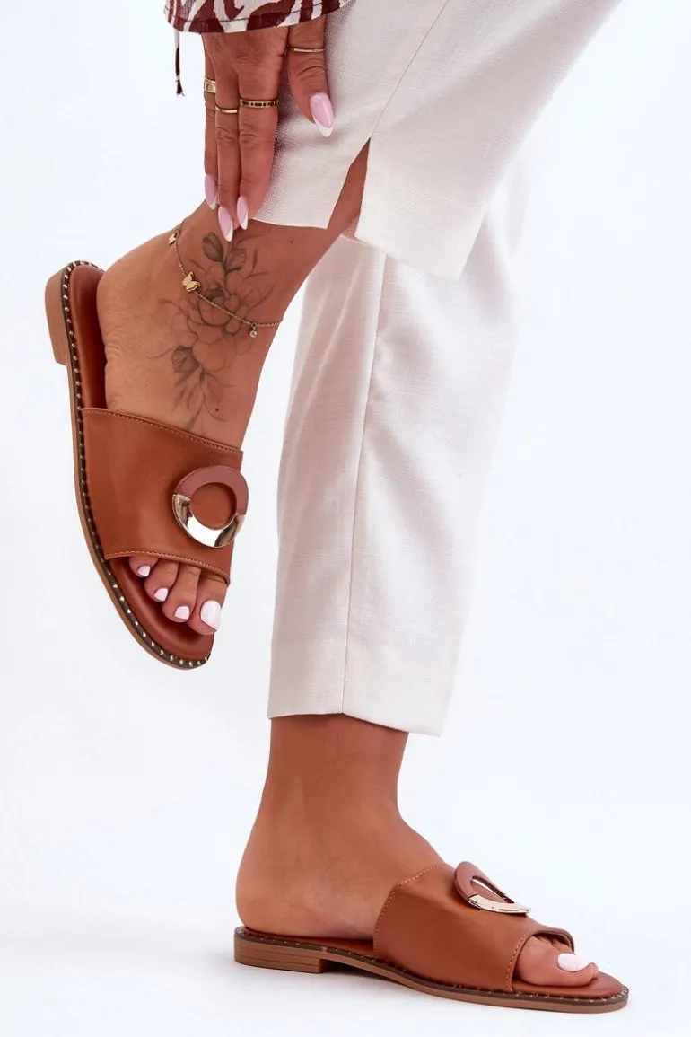 Damskie klapki zostały wykonane z eko skóry. Posiadają na przodzie ozdobę w postaci koła. Klapki osadzono na płaskim obcasie i antypoślizgowej, gumowej podeszwie. Wkładka jest niezwykle miękka i wygodna w użytkowaniu, co zwiększa komfort użytkowania. Nosek w tych klapkach jest odkryty i lekko zaokrąglony. Dodatkowo przy podeszwie znajdują się ozdobne ćwieki. Przy wyborze rozmiaru prosimy sugerować się tabelą rozmiarów.
