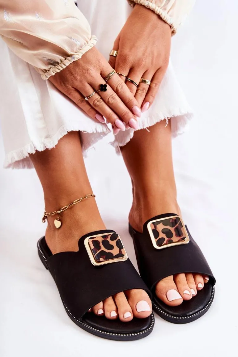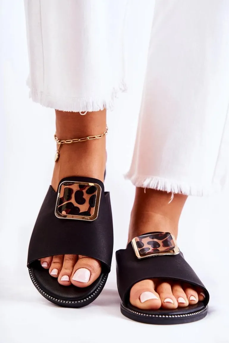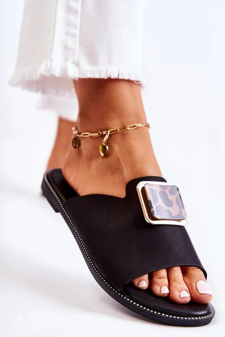 Klapki damskie z ozdobnym elementem na przodzie. Wykonane z wierzchu z tworzywa sztucznego, natomiast wkładka z eko skóry. Podeszwa wykonana z gumowego tworzywa, która jest dodatkowo antypoślizgowa. Nosek odkryty, zaokrąglony. Wokół podeszwy znajdują się ozdobne ćwieki. Klapki osadzone na płaskim obcasie. Model, który świetnie sprawdzi się w upalne dni! Klasyczne klapki sprawdzą się na co dzień do pracy, na zakupy czy spotkanie ze znajomymi. Przy wyborze rozmiaru prosimy sugerować się tabelą rozmiarów.