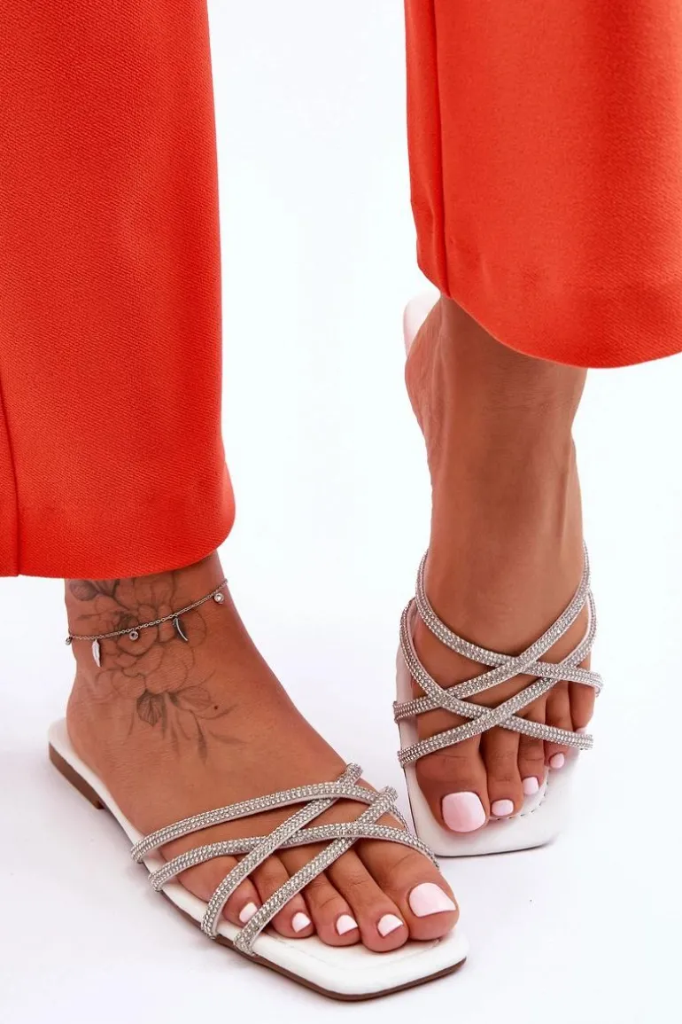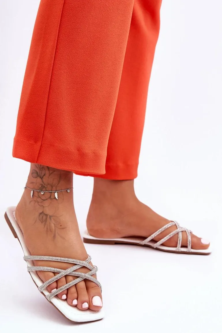 Damskie Klapki Z Paseczkami I Dżetami Białe Leomi