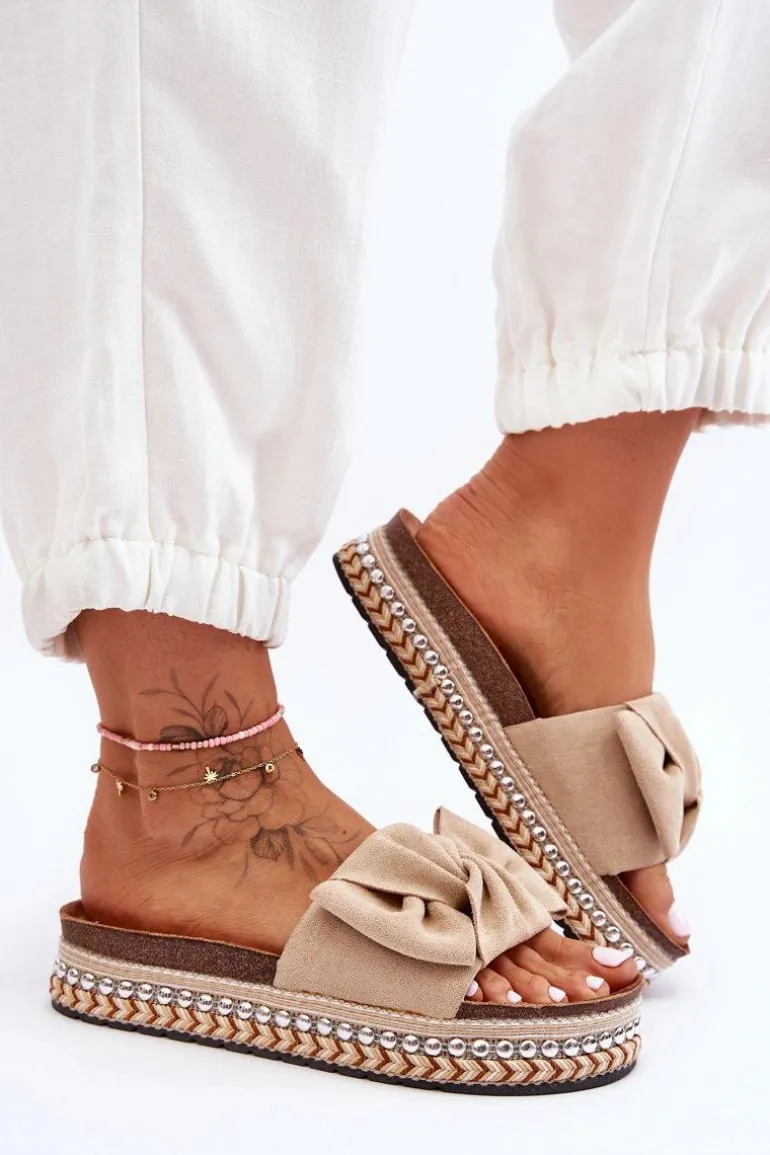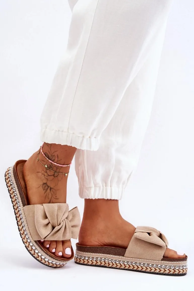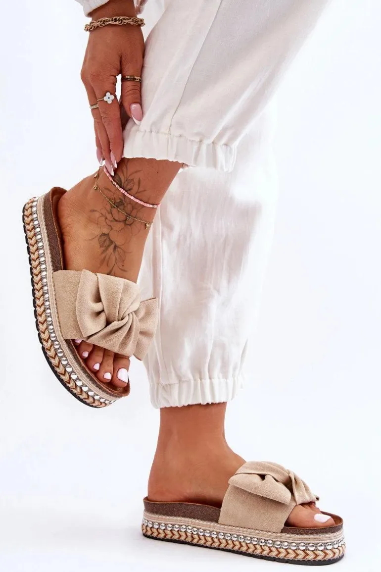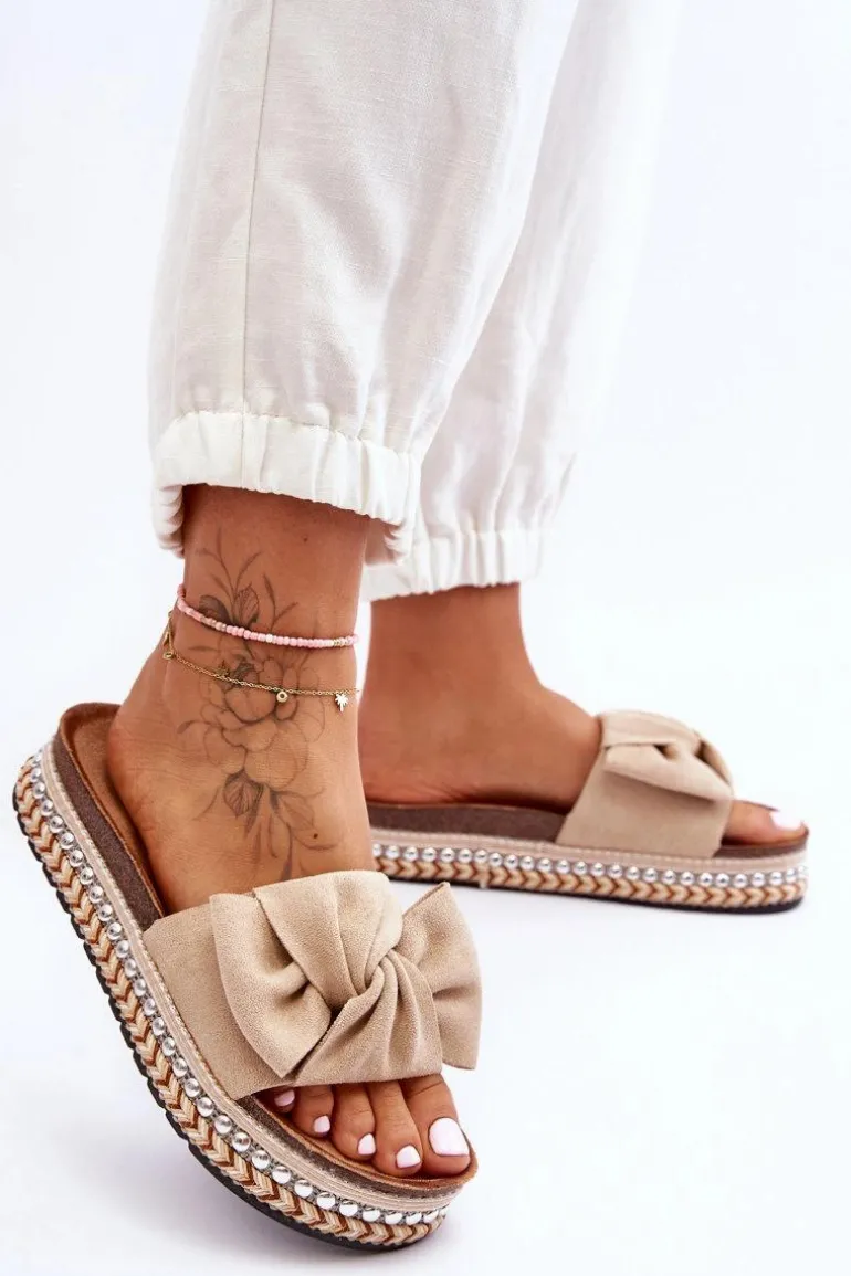 Damskie Klapki Zamszowe Z Kokardą Beżowe Lauria