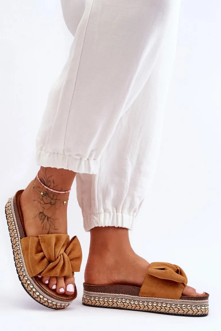 Klasyczne, damskie klapki zostały osadzone na masywnej platformie ze zdobieniami w postaci sznureczków oraz ćwieków. Wykonane z eko zamszu. Na przodzie znajduje się ozdoba w postaci kokardy. Profilowana wkładka jest wykonana z przyjemnego w dotyku eko zamszu. Te klapki to idealny model na lato! Przy wyborze rozmiaru prosimy sugerować się tabelą rozmiarów.