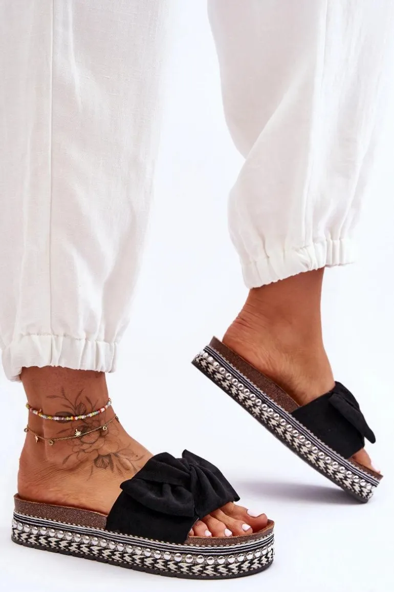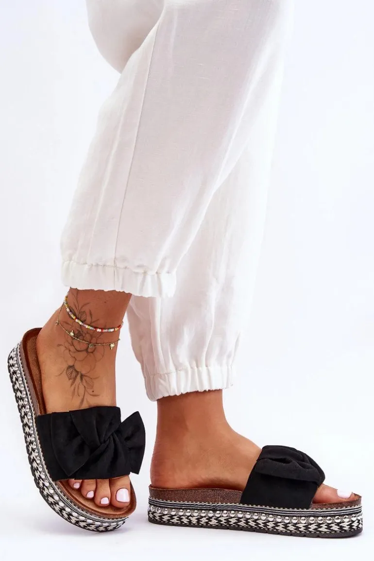 Damskie Klapki Zamszowe Z Kokardą Czarne Lauria