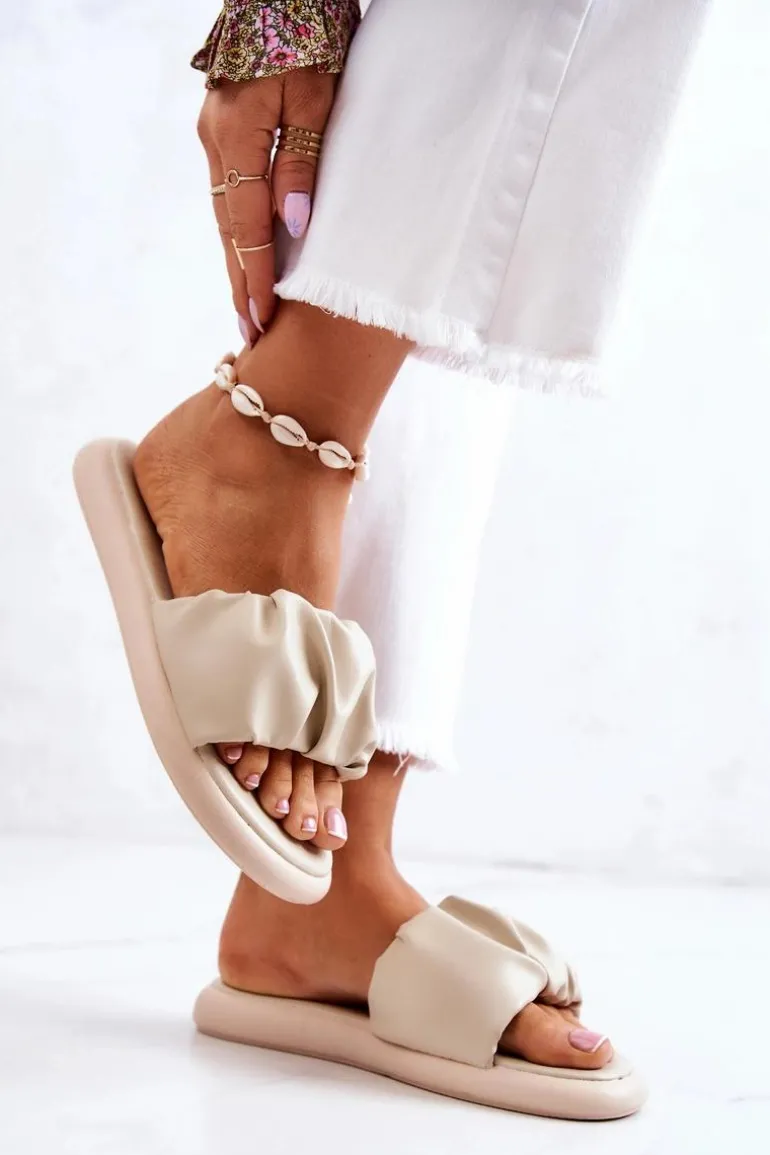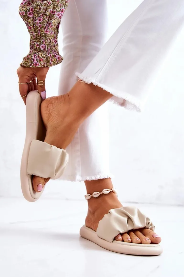 Eleganckie klapki damskie posiadają miękką wkładkę z eko skóry. Eleganckie marszczenia z eko skóry sprawiają, że buty wyglądają naprawdę cudnie. Delikatna platforma oraz podeszwa wykonane z tworzywa sztucznego. Klapki te dopełnią wiele letnich stylizacji! Świetnie będą pasować do stylizacji boho. Zachwycaj wyglądem i kup je już dziś! Koniecznie sprawdź całą naszą kolekcję klapek damskich. Przy wyborze rozmiaru prosimy sugerować się tabelą rozmiarów.