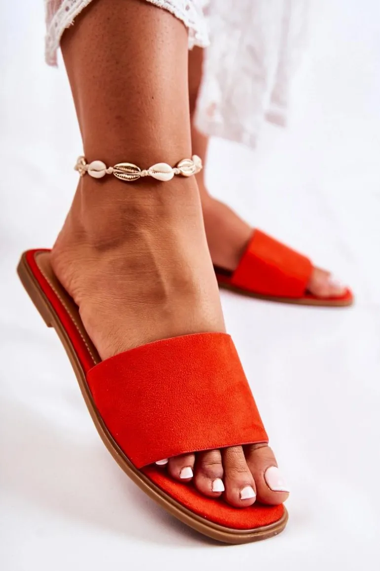 Klasyczne damskie klapki świetnie sprawdzą się w upalne dni! Wykonane z wierzchu z miłego w dotyku eko zamszu. Klapki są gładkie, nie posiadają żadnych ozdób, przez co świetnie będą pasować do stylizacji np.: z wzorami geometrycznymi czy kwiecistymi. Wkładka wykonana z połączenia eko zamszu oraz eko skóry. Nosek odkryty, kwadratowy. Klapki osadzone na płaskim obcasie oraz antypoślizgowej podeszwie wykonanej z gumowego tworzywa. Przy wyborze rozmiaru prosimy sugerować się tabelą rozmiarów.