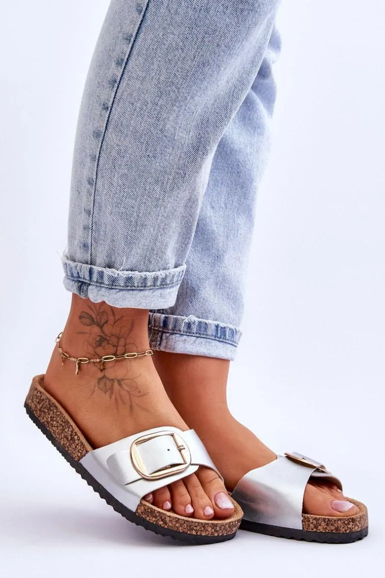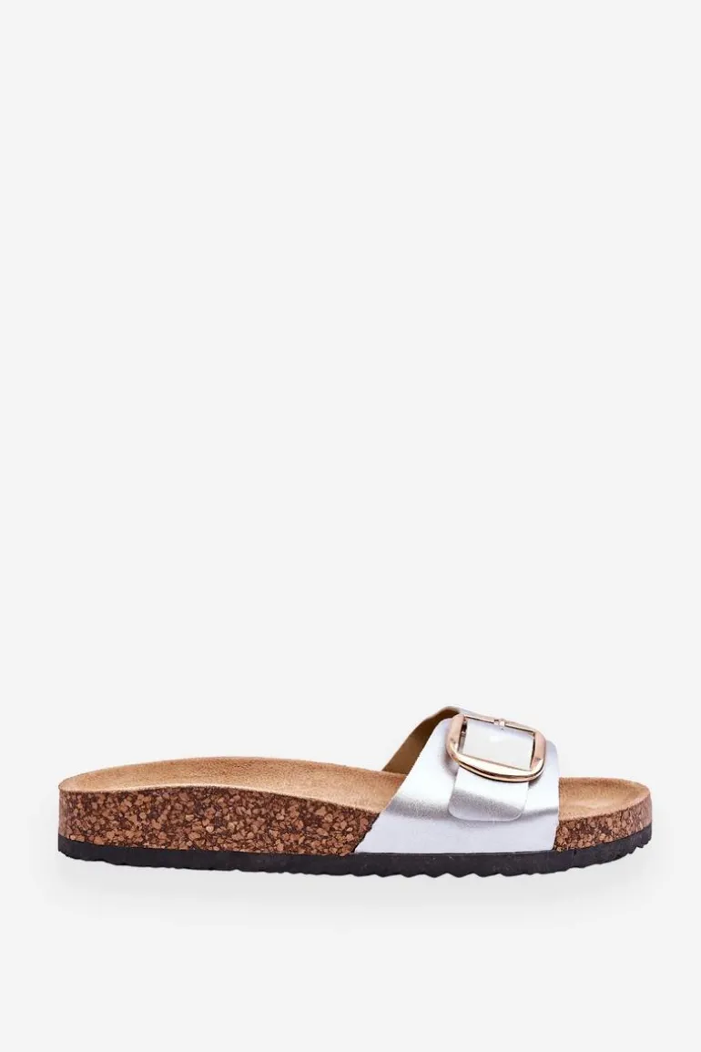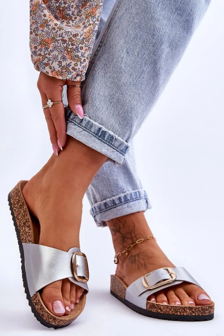 Damskie, klasyczne klapki zostały wykonane z eko skóry. Model ten posiada pasek z ozdobną klamrą. Klapki świetnie wkomponują się w wiele letnich stylizacji. Profilowana wkładka została wykonana z eko zamszu. Klapki osadzono na korkowej platformie i podeszwie z tworzywa sztucznego. Przy wyborze rozmiaru prosimy sugerować się tabelą rozmiarów.