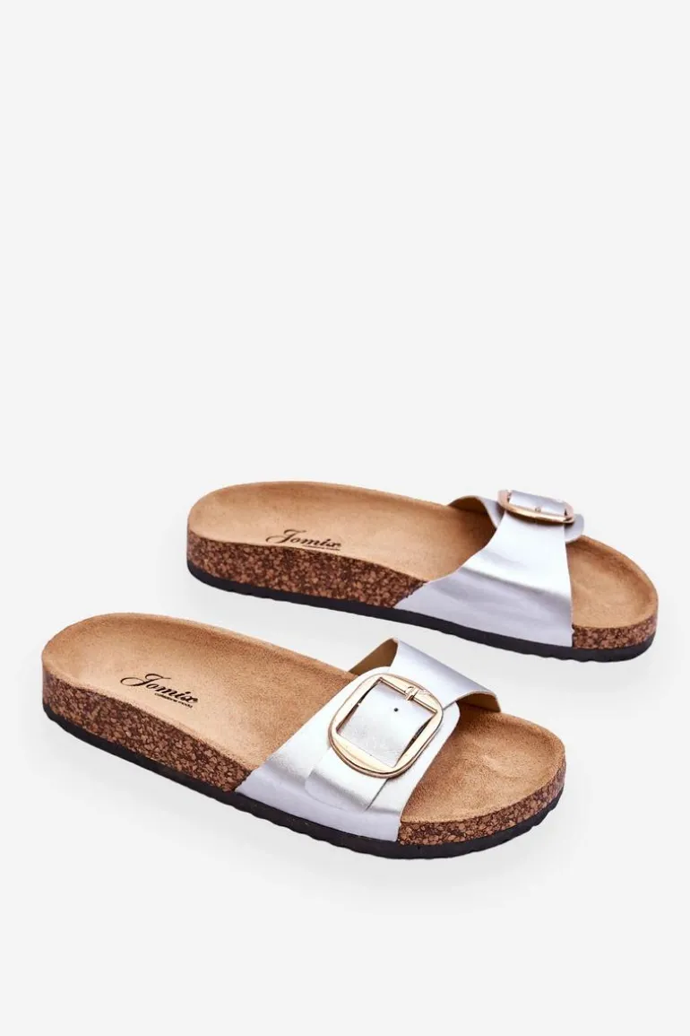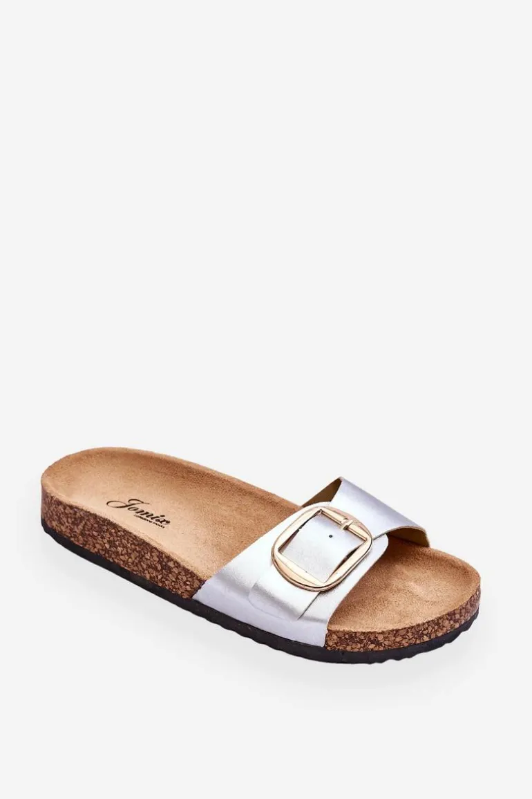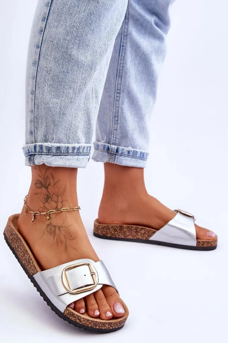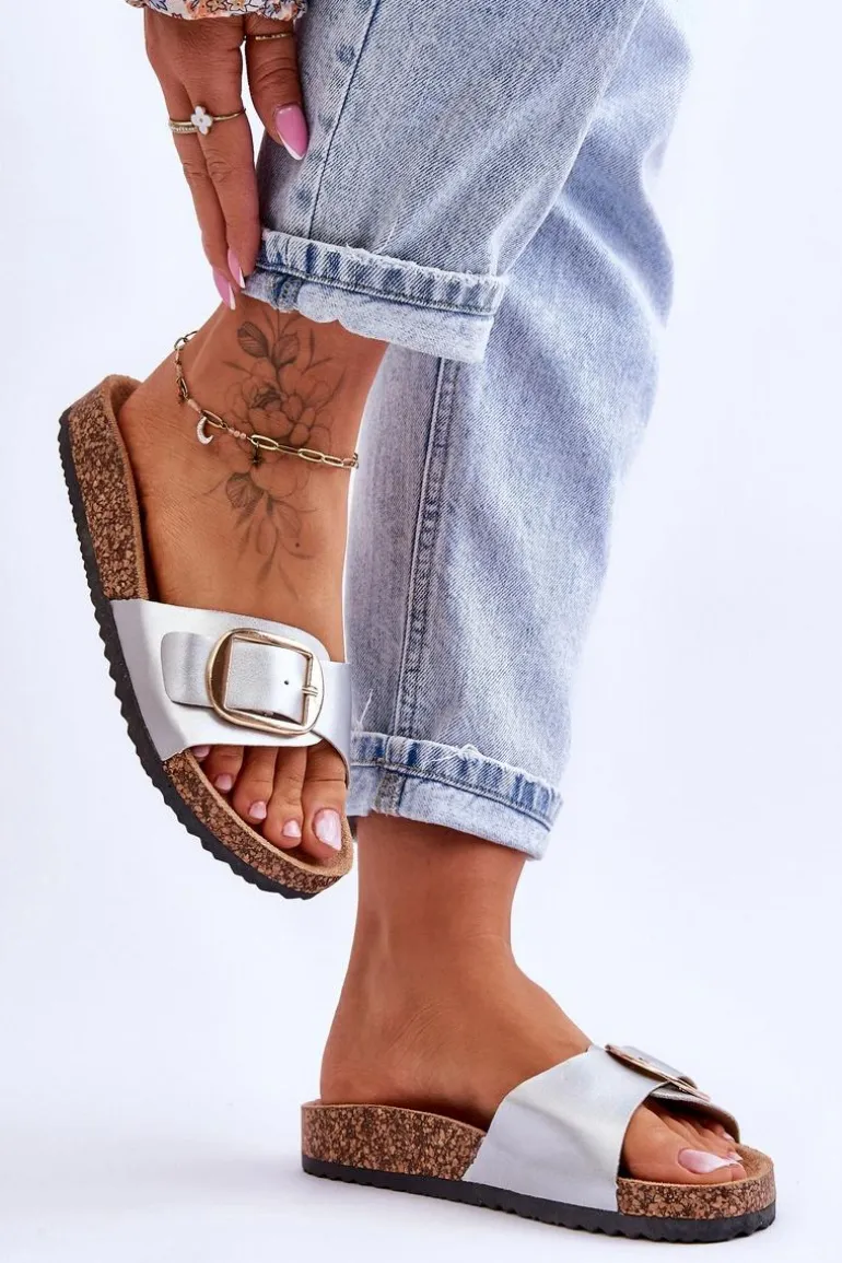 Damskie, klasyczne klapki zostały wykonane z eko skóry. Model ten posiada pasek z ozdobną klamrą. Klapki świetnie wkomponują się w wiele letnich stylizacji. Profilowana wkładka została wykonana z eko zamszu. Klapki osadzono na korkowej platformie i podeszwie z tworzywa sztucznego. Przy wyborze rozmiaru prosimy sugerować się tabelą rozmiarów.