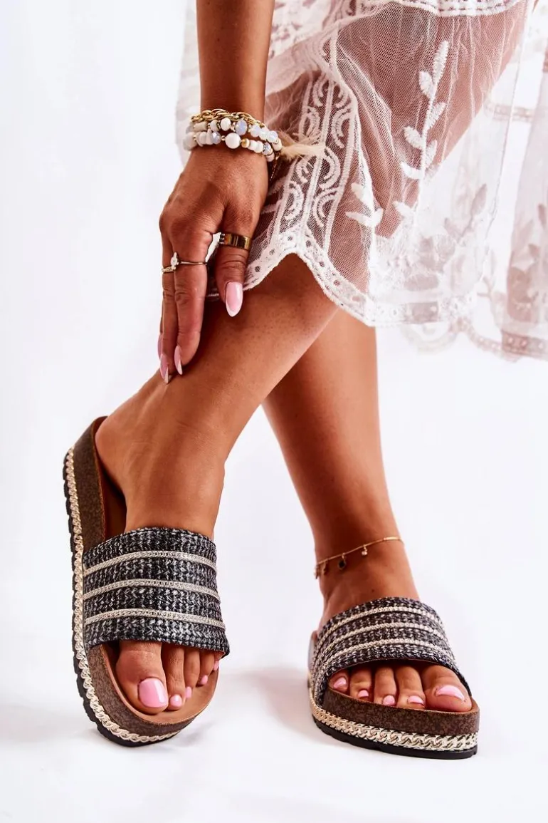 Damskie klapki wykonane z wierzchu z tworzywa sztucznego w postaci plecionych warkoczy. Posiadają ozdobne łańcuszki na przodzie oraz wokół podeszwy. Model klasyczny, wsuwany. Wkładka Comfort wykonana z eko skóry. Klapki są osadzone na platformie. Podeszwa wykonana z tworzywa sztucznego. Nosek odkryty, zaokrąglony. Idealny model na co dzień! Te buty świetnie sprawdzą się podczas spaceru, zakupów czy nawet do domu zamiast papci.Przy wyborze rozmiaru prosimy sugerować się tabelą rozmiarów.