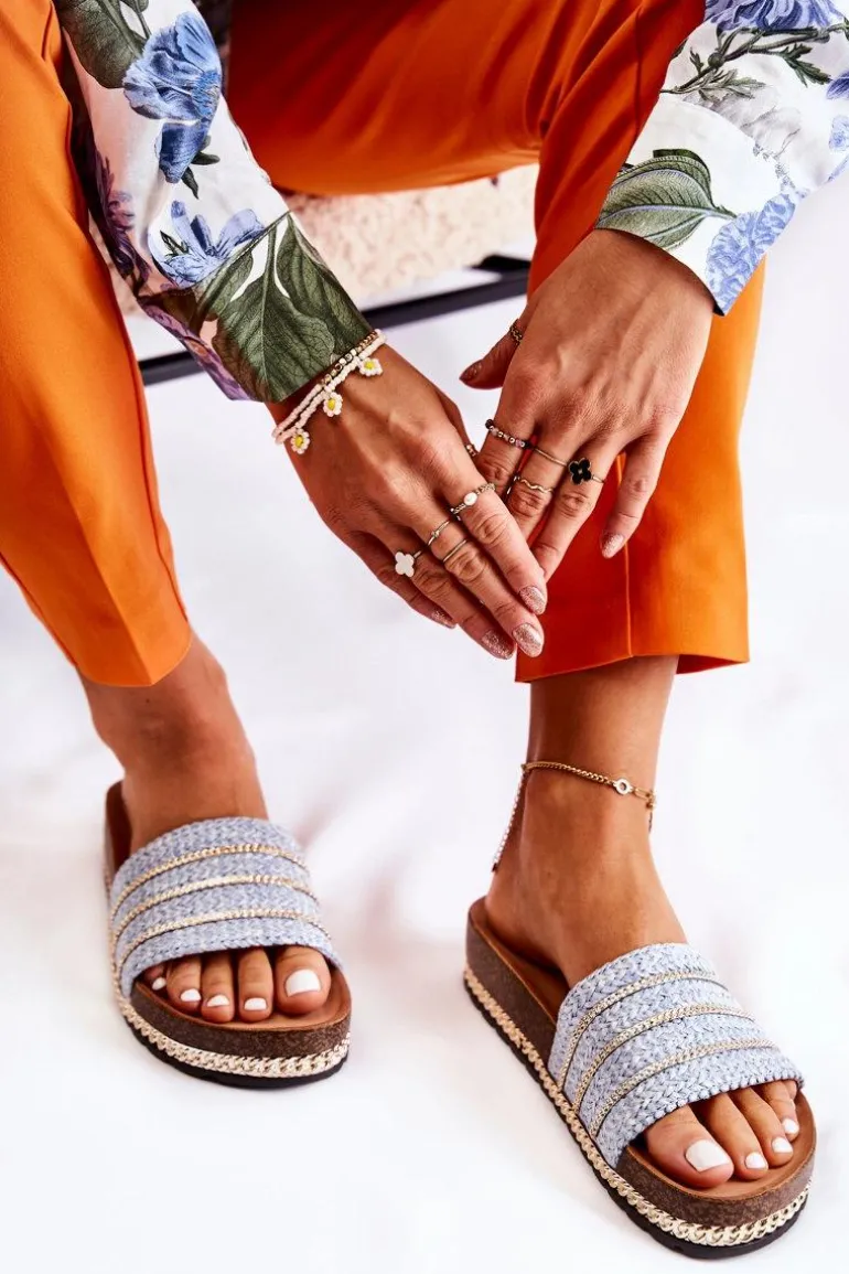 Damskie klapki wykonane z wierzchu z tworzywa sztucznego w postaci plecionych warkoczy. Posiadają ozdobne łańcuszki na przodzie oraz wokół podeszwy. Model klasyczny, wsuwany. Wkładka Comfort wykonana z eko skóry. Klapki są osadzone na platformie. Podeszwa wykonana z tworzywa sztucznego. Nosek odkryty, zaokrąglony. Idealny model na co dzień! Te buty świetnie sprawdzą się podczas spaceru, zakupów czy nawet do domu zamiast papci.Przy wyborze rozmiaru prosimy sugerować się tabelą rozmiarów.
