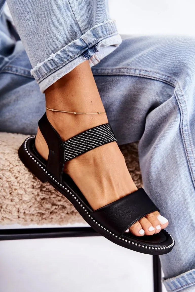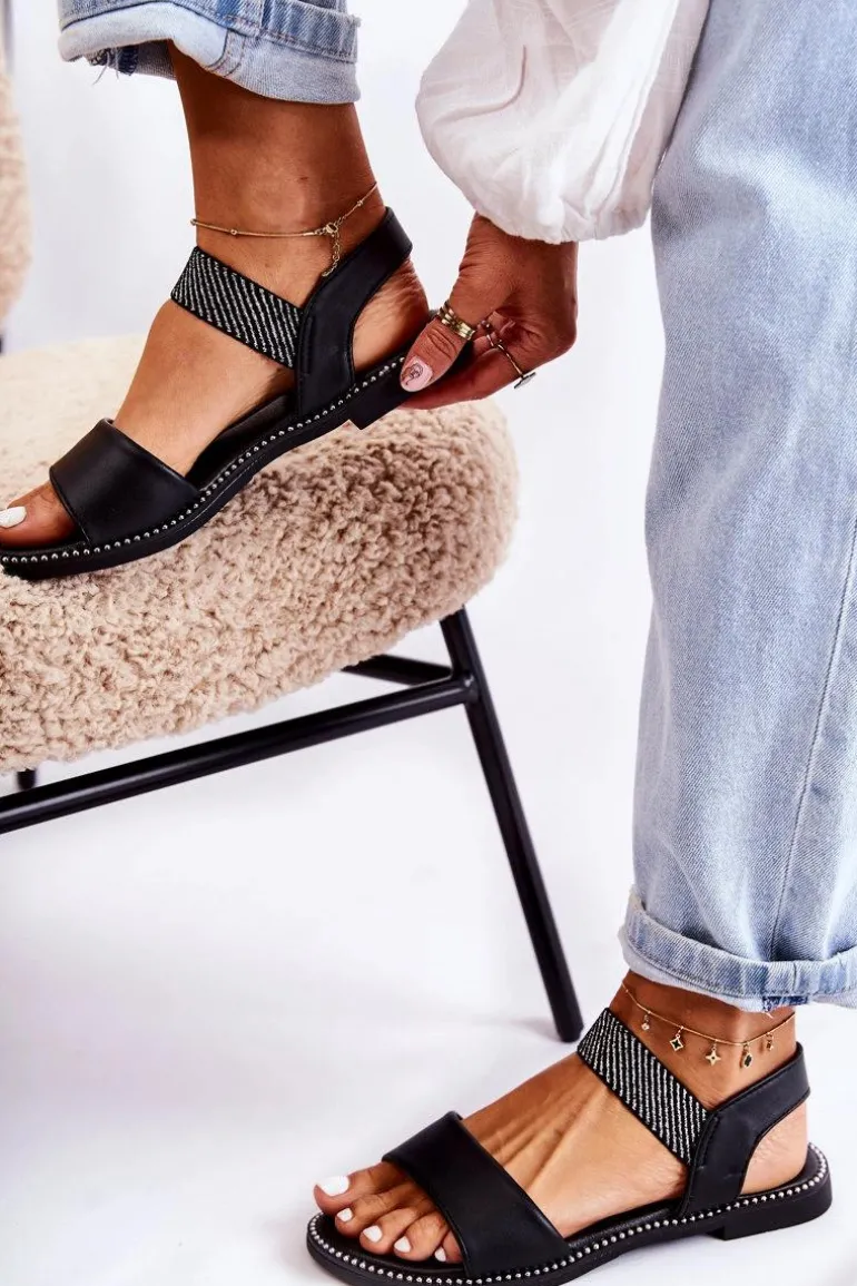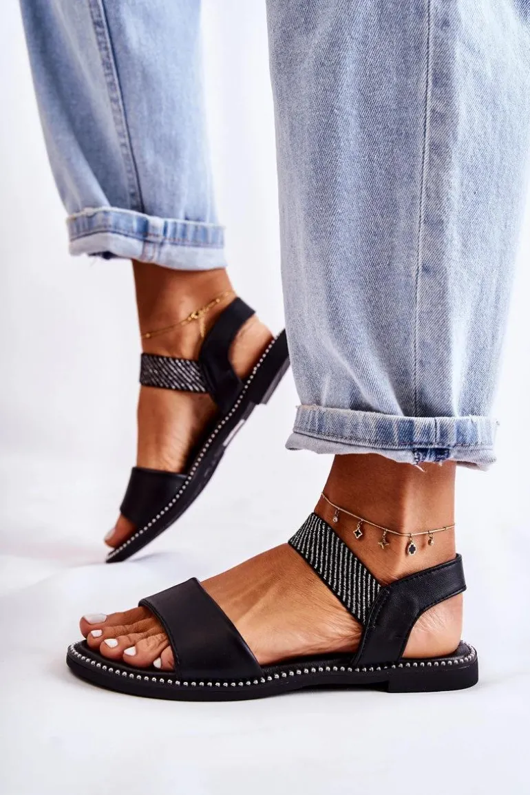 Idealne sandały na upalne dni! Klasyczny, wsuwany model. Buty wykonane z eko skóry. Dodatkowo posiadają ściągacz, dzięki któremu buty odpowiednio dopasują się do tęgości nogi. Wkładka jest miękka i wygodna w użytkowaniu. Buty osadzone na płaskim obcasie, z podeszwą antypoślizgową. Dodatkowo sandałki są przyozdobione dżetami. Nosek odkryty, zaokrąglony. Świetnie sprawdzą się podczas codziennego użytkowania. Przy wyborze rozmiaru prosimy kierować się tabelą rozmiarów.