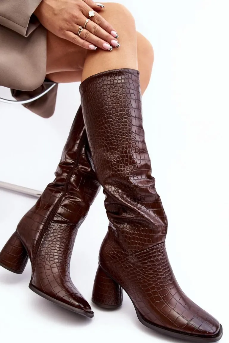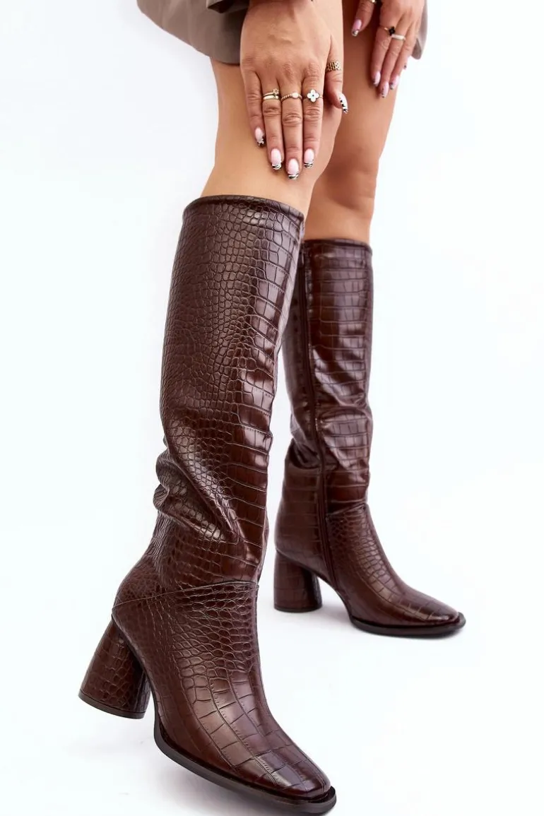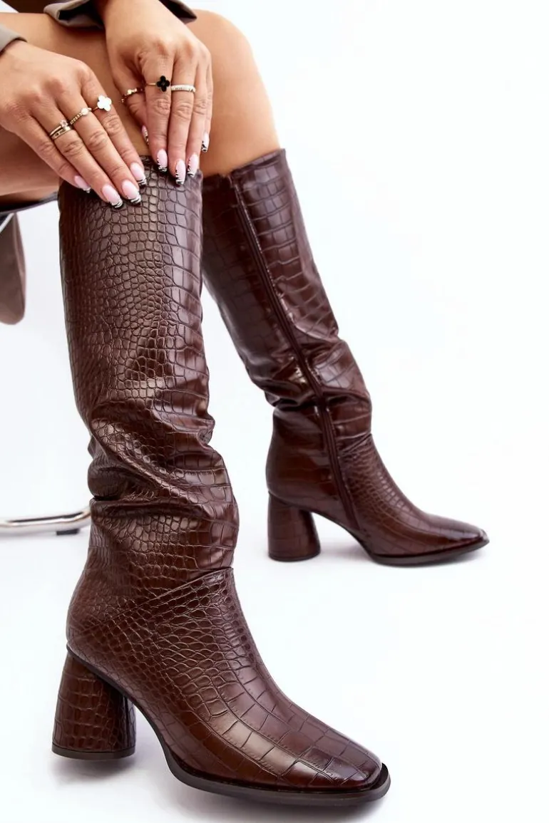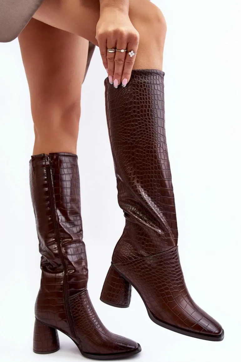Kozaki damskie z cholewką do kolana w wężowy wzór. Osadzone na obcasie słupku. Wykonane z eko skóry. Zapinane na suwak z boku. Środek ocieplony kocem obuwniczym. Noski w kwadrat. Wykorzystasz je w wielu stylizacjach! Przy wyborze rozmiaru prosimy sugerować się tabelą rozmiarów.