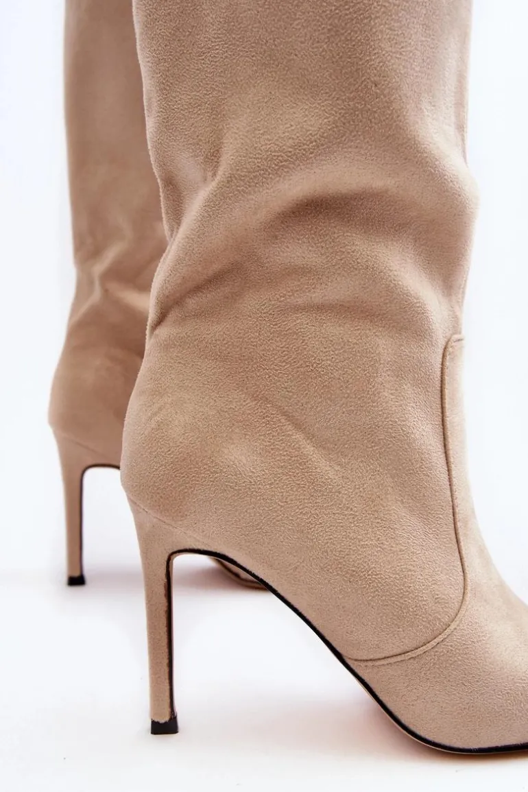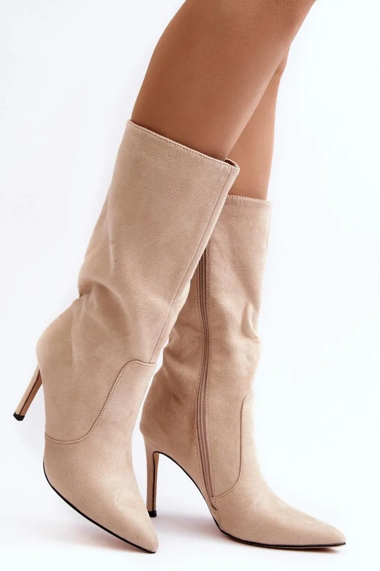 Kozaki damskie wykonane z eko zamszu. Osadzone na zgrabnej szpilce, co dodaje im kobiecego uroku, a jednocześnie gwarantuje elegancję. Ocieplenie w postaci koca obuwniczego zapewnia ciepło i komfort w chłodniejsze dni. Delikatnie szpiczaste noski optycznie wysmuklają nogi, dodając subtelnego wdzięku. Suwak na całej długości cholewki ułatwia zarówno zakładanie, jak i zdejmowanie butów. Ten wyjątkowy model zasługuje na swoje miejsce w Twojej garderobie! Przy wyborze rozmiaru prosimy sugerować się tabelą rozmiarów.