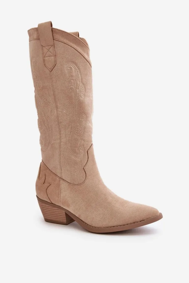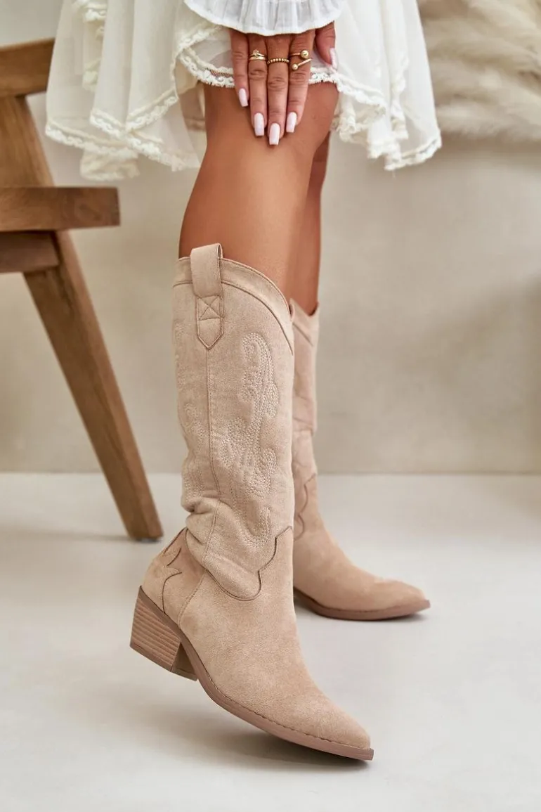 Damskie Kozaki Kowbojki Na Niskim Obcasie Z Eko Zamszu Beżowe Ligelia