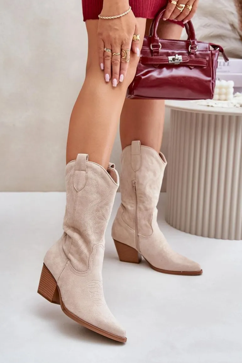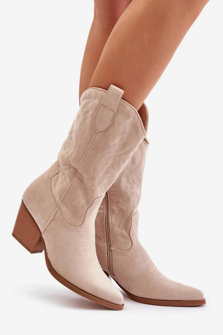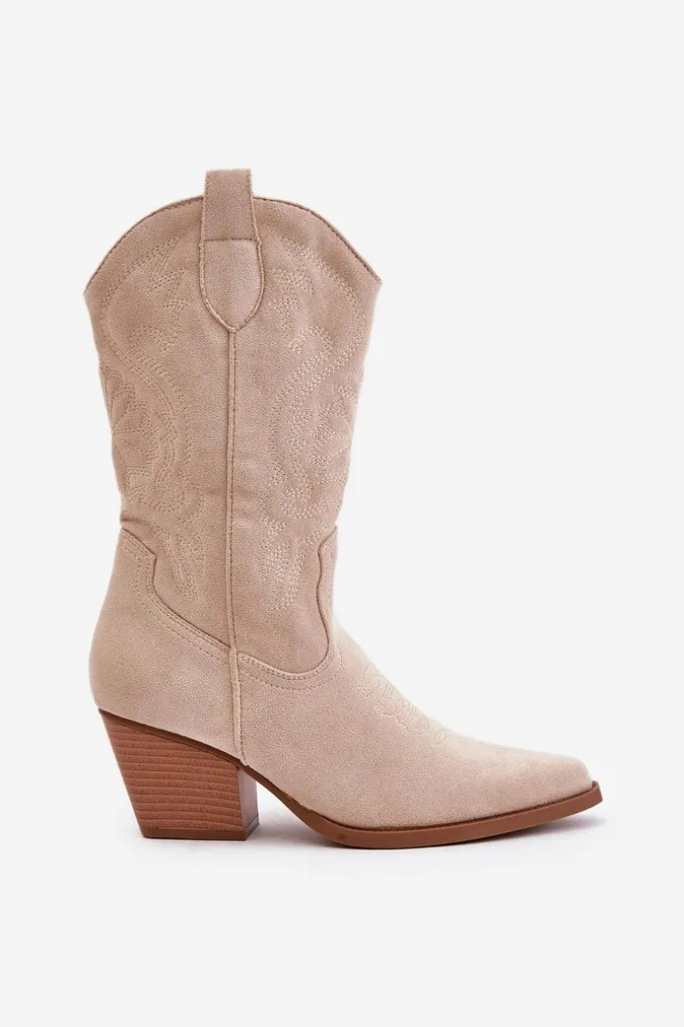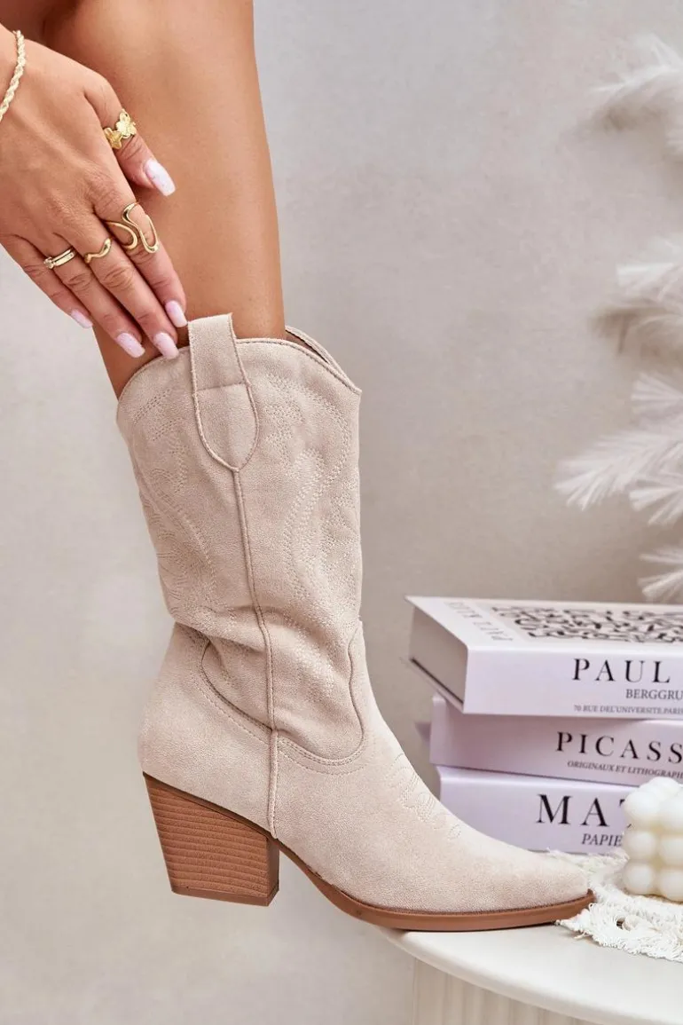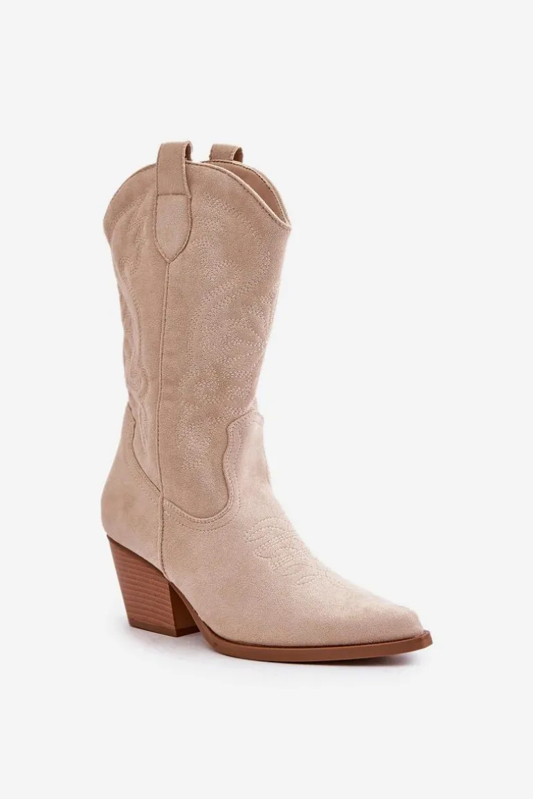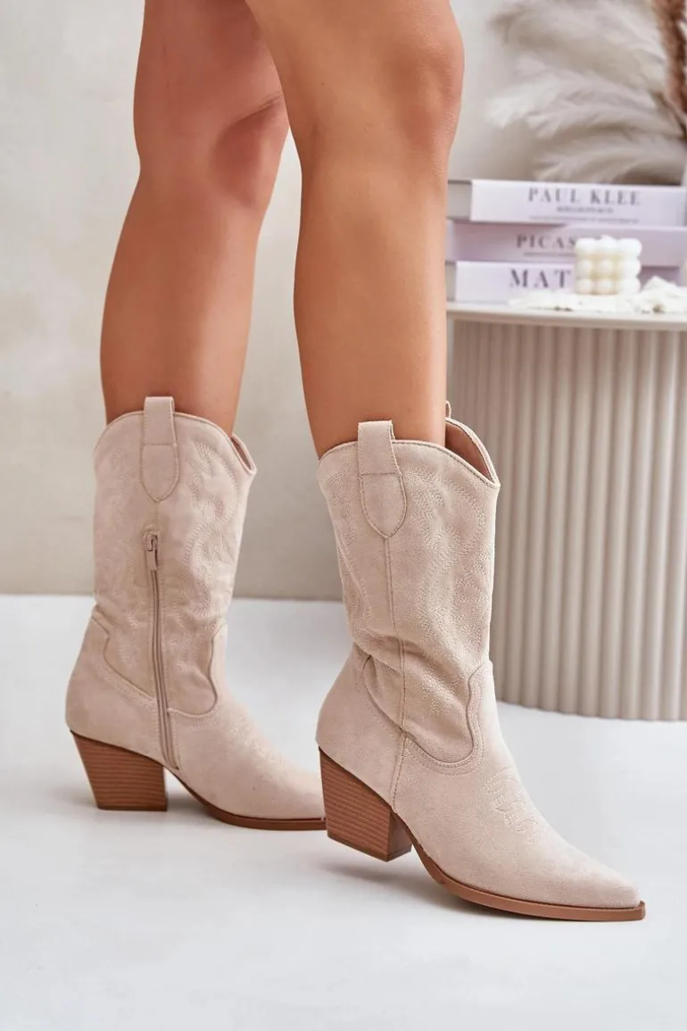 Damskie Kozaki Kowbojki Na Słupku Z Eko Zamszu Jasnobeżowe Wendlis