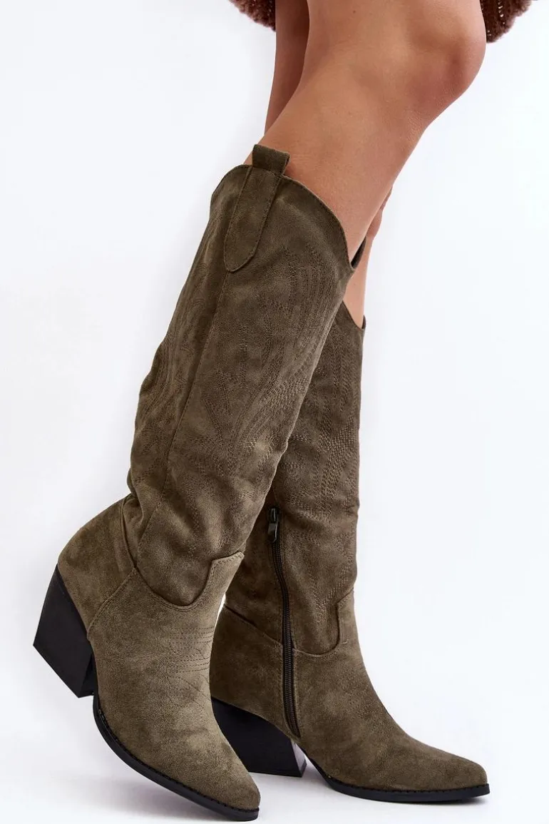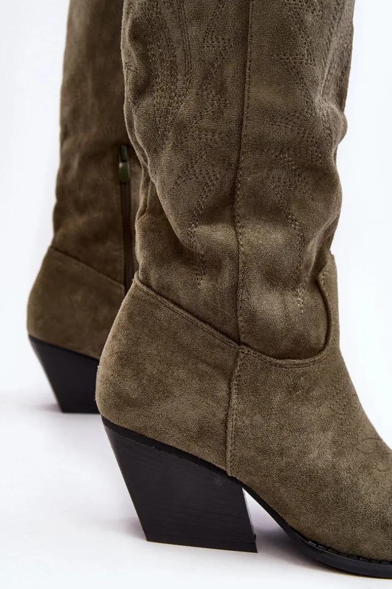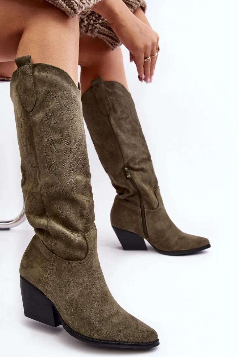 Damskie kozaki przed kolano wykonane z eko zamszu. Osadzone na obcasie w postaci niskiego słupka. Noski w szpic optycznie wysmuklą nogi. Zapiętek jest usztywniony. Miękka wkładka zapewni komfort podczas użytkowania. Cholewka ozdobiona licznymi przeszyciami. Model wsuwany z dodatkowym suwakiem. Świetnie sprawdzą się podczas jesiennych stylizacji! Przy wyborze rozmiaru prosimy sugerować się tabelą rozmiarów.