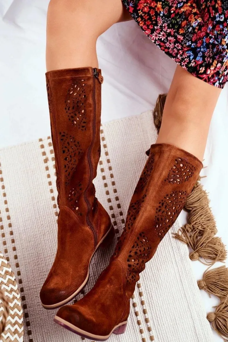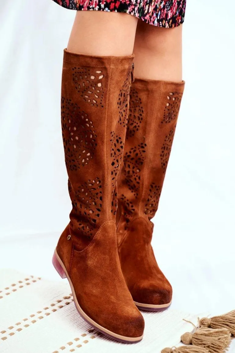 Damskie Kozaki Maciejka Skórzane Ażurowe Camel 04525-29