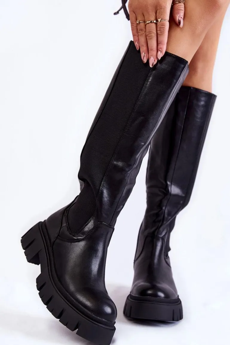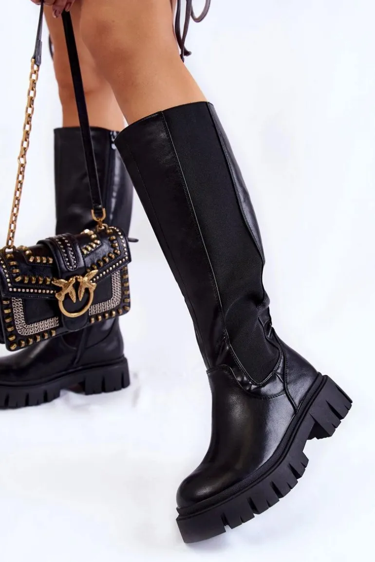 Modne, damskie kozaki zostały wykonane z wysokiej jakości eko skórzanych materiałów. Posiadają suwak na całej długości cholewki oraz usztywniany zapiętek. Dodatkowo po zewnętrznej stronie znajduje się elastyczna wstawka. Kozaki zostały osadzone na płaskim obcasie i platformie ze żłobieniami. Model do kolana. Fason ten posiada ocieplenie w postaci miłego w dotyku, krótkiego futerka. Klasyczny fason sprawdzi się do wielu stylizacji! Przy wyborze rozmiaru prosimy kierować tabelą rozmiarów.