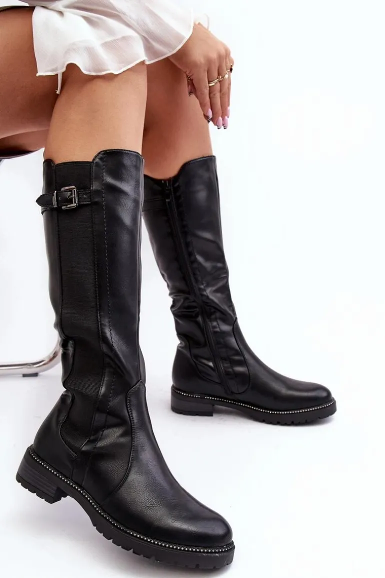 Damskie kozaki wykonane z eko skóry. Osadzone na płaskim, stabilnym obcasie. Zapinane suwakiem. Na cholewce elastyczna wstawka oraz pasek z klamrą. Noski zaokrąglone. Klasyczny fason sprawdzi się do wielu stylizacji! Środek ocieplony kocem obuwniczym. Przy wyborze rozmiaru prosimy kierować tabelą rozmiarów.