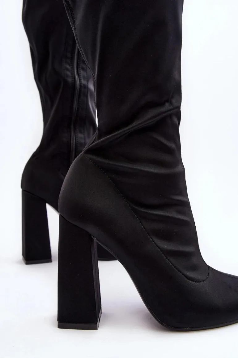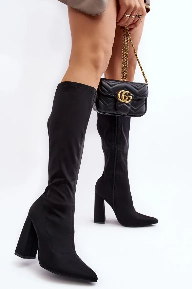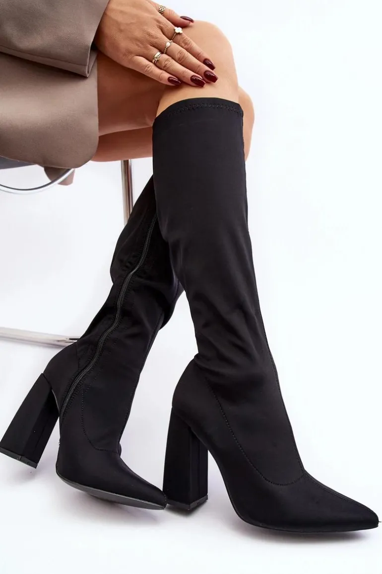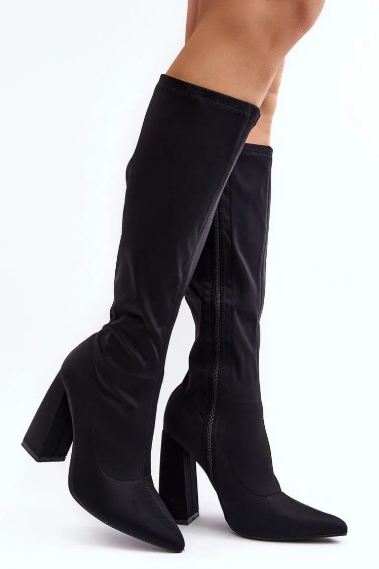Kozaki damskie wykonane z materiału tekstylnego. Model zapinany na suwak. Cholewka do kolana. Obcas słupek. Noski w szpic optycznie wysmuklą nogi. Idealne sukienek czy spódnic! Koniecznie powinnaś je mieć! Przy wyborze rozmiaru prosimy sugerować się tabelą rozmiarów.