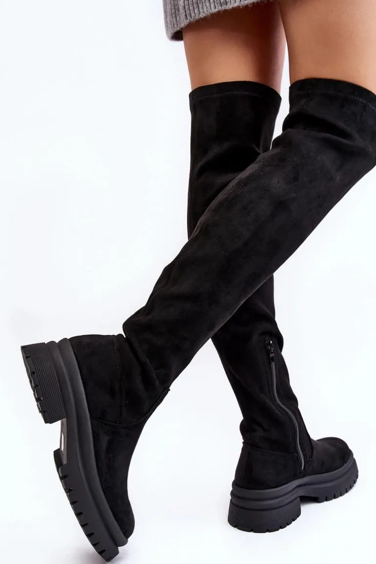 Damskie kozaki z cholewką za kolano. Wykonane z eko zamszu. Osadzone na masywnej podeszwie i płaskim obcasie. Noski zaokrąglone. Usztywniony zapiętek. Wkładka lekko ocieplona kocem obuwniczym. Klasyczny fason sprawdzi się do wielu jesienno-zimowych stylizacji! Przy wyborze rozmiaru prosimy kierować tabelą rozmiarów.